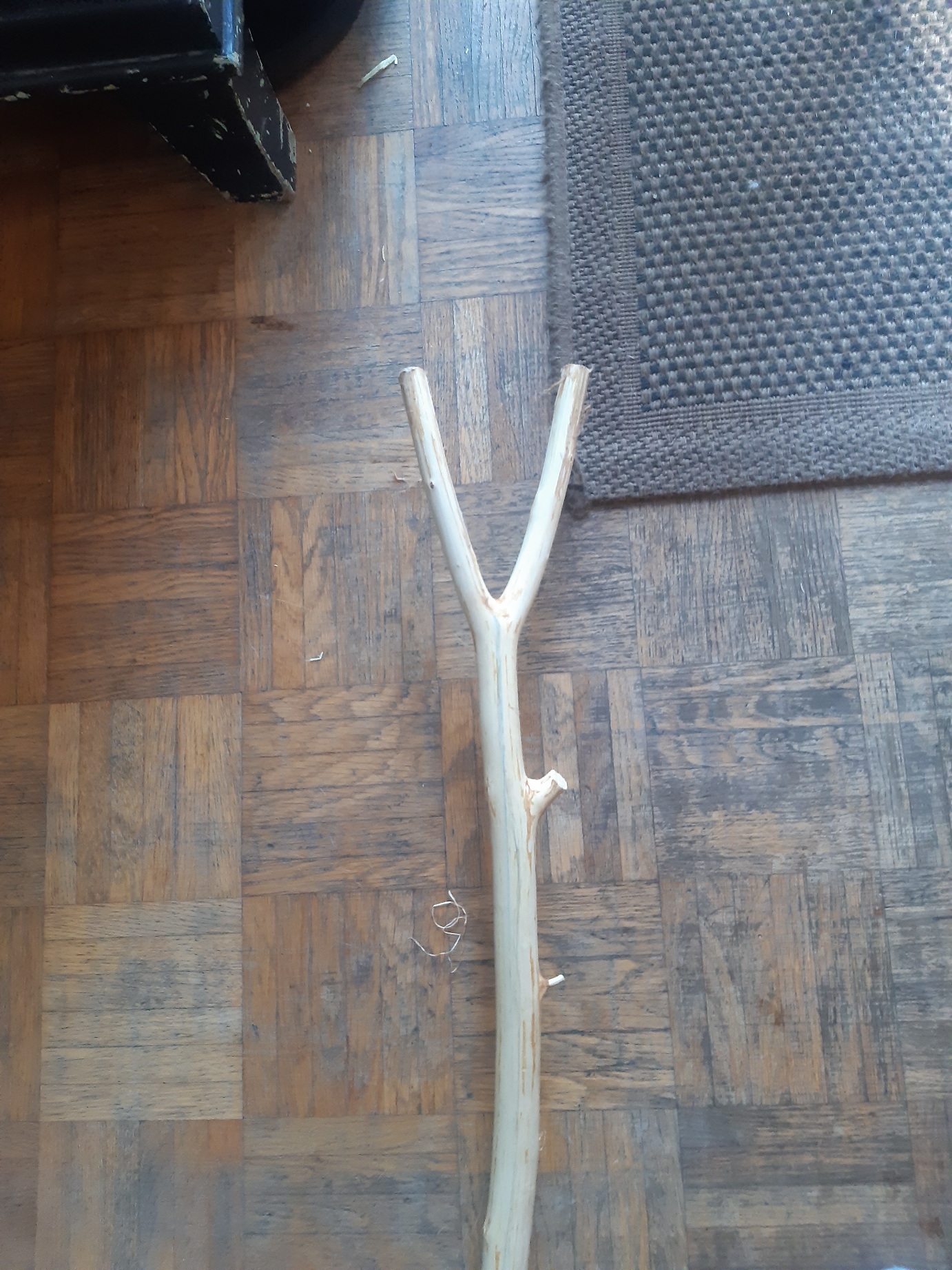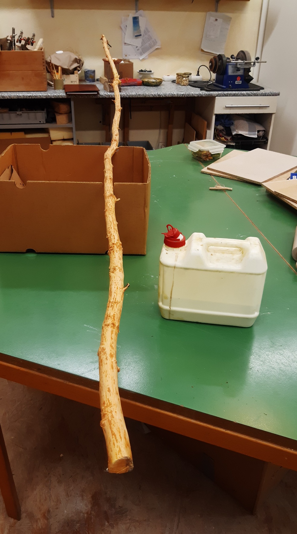 Der lange Ulmenstab, hat ein paar Tage in der trockenen Werkstatt und die letzte Nacht noch trockner im Wohnzimmer verbracht. Er hat in dieser Woche noch