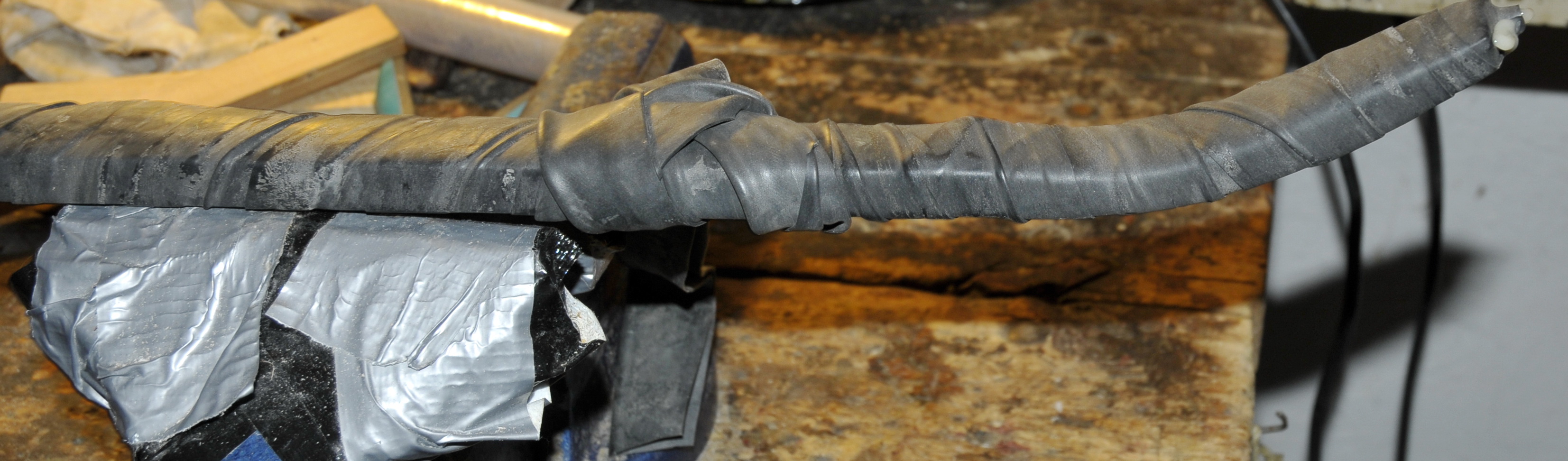 Als Unterlage habe ich dann das Hainbuchenlaminat noch mit Aceton gereinigt und Epoxy angerührt, 26 g und dann das Hasel/Traubenkirschenkonstrukt mit der Hainbuche verbunden, ich hab wieder mit einem alten Fahrradschlauch gewickelt.