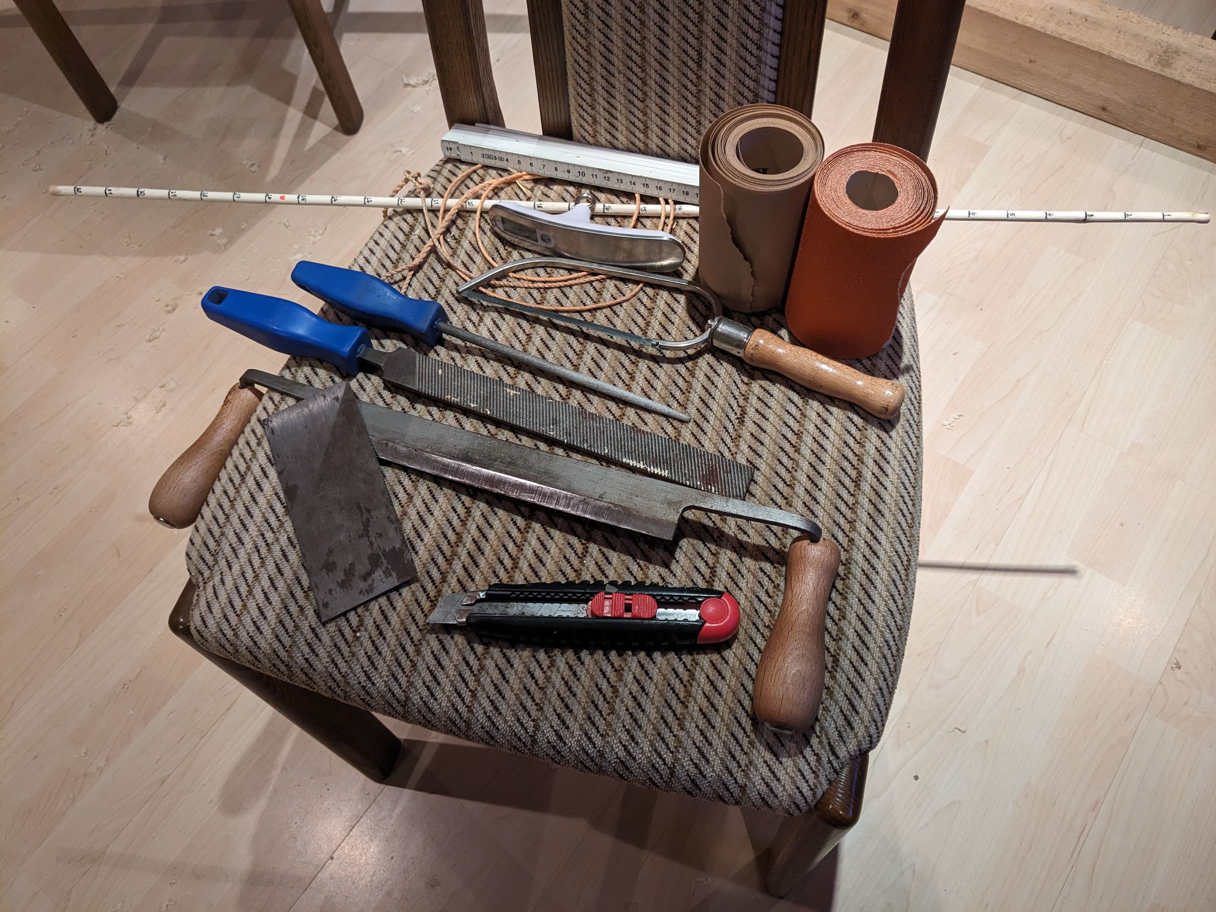 Ich habe nach der Arbeit mit dem Zugmesser eigentlich erwartet mich mit dem Floor-Tiller zu beschäftigen. Stattdessen konnte ich schon die Tillersehne schon fast auf Standhöhe aufspannen.