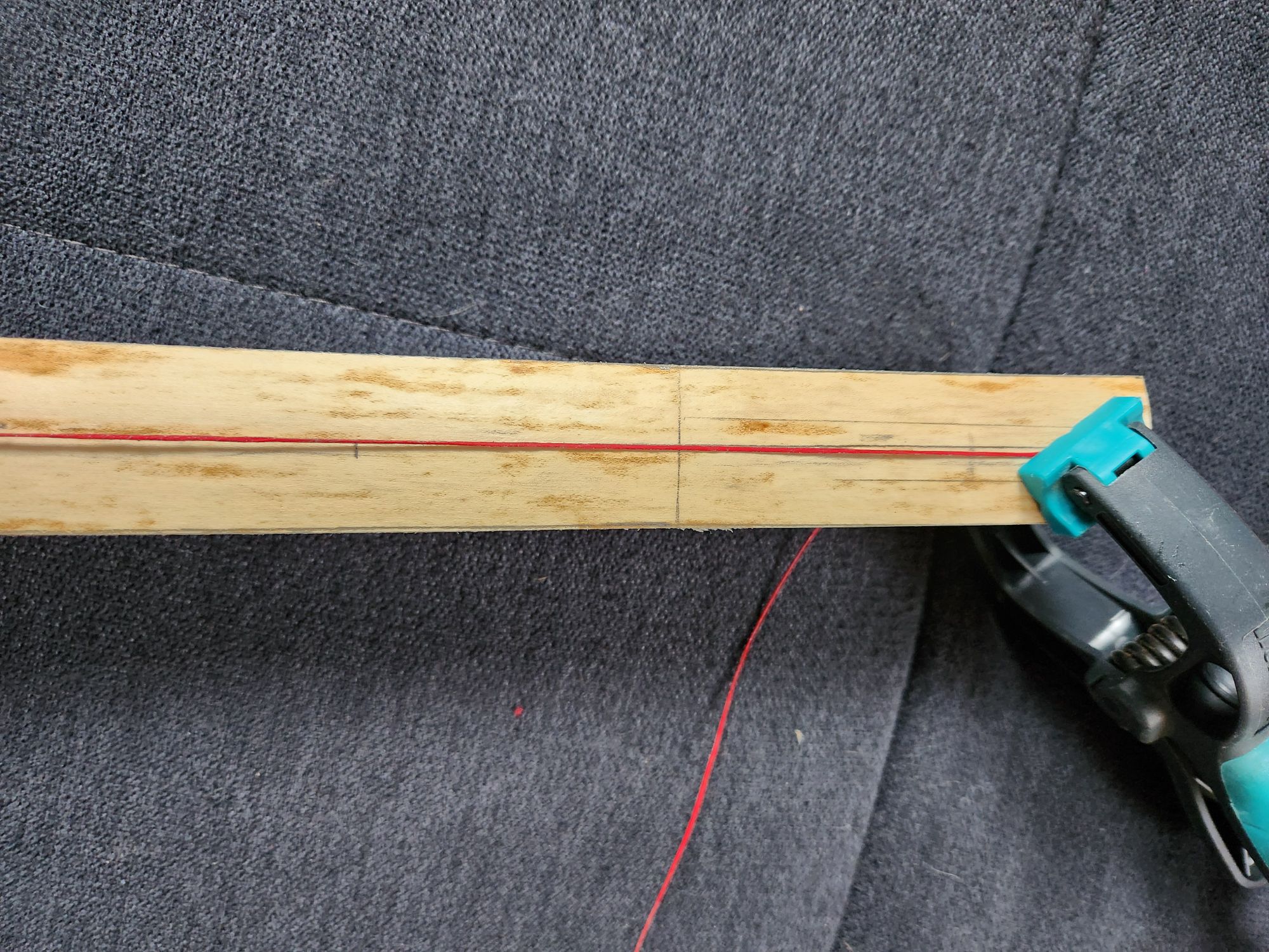 Nach dem aufzeichnen einer neuen Sehnenlage hab ich versucht zu ermitteln in welchem Winkel ich die Schlitze an den Enden schneiden muss, damit die Recurves dann perfekt in Linie stehen. Ich kann nicht in Worte fassen wie ich das gemacht habe. Vielleicht verstehts ja jemand anhand des Fotos