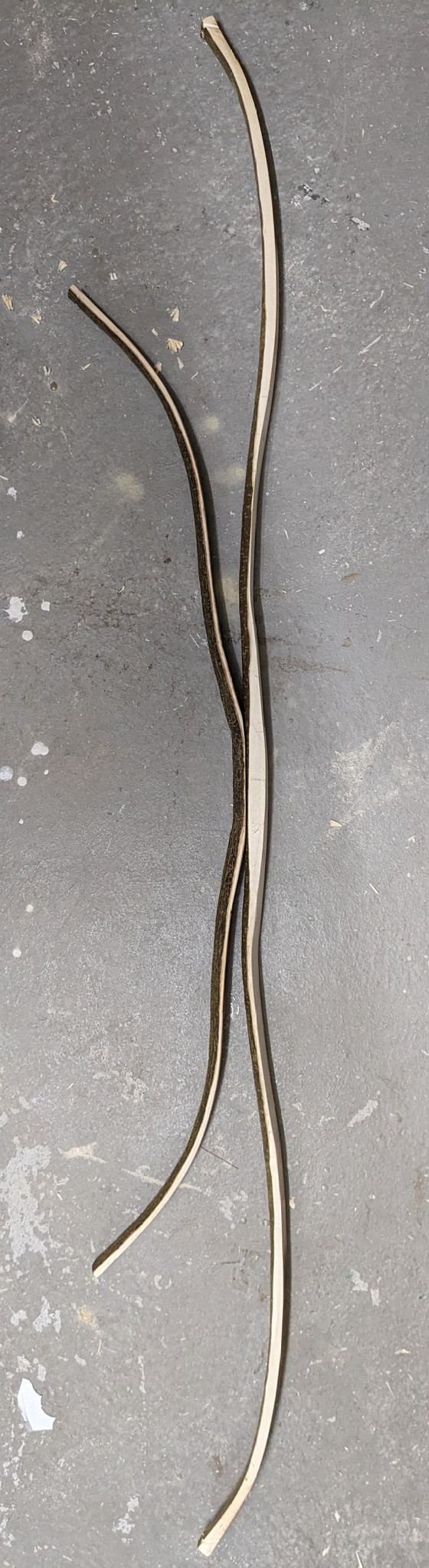 Ich hab nun doch noch einen dritten Bogen mit 60cm gemacht. Beim ersten mal biegen mit der hlp war ich zu ungeduldig und er ist gerissen. Also nochmal ein Brettchen aus dem Rest von Hasel 2 geschnitzt und dann mit mehr Geduld gebogen. Direkt nach dem Griff haben sich zwar einige Späne abgehoben, sollte aber handhabbar sein. Mit Dampf hätte es wahrscheinlich besser funktioniert.