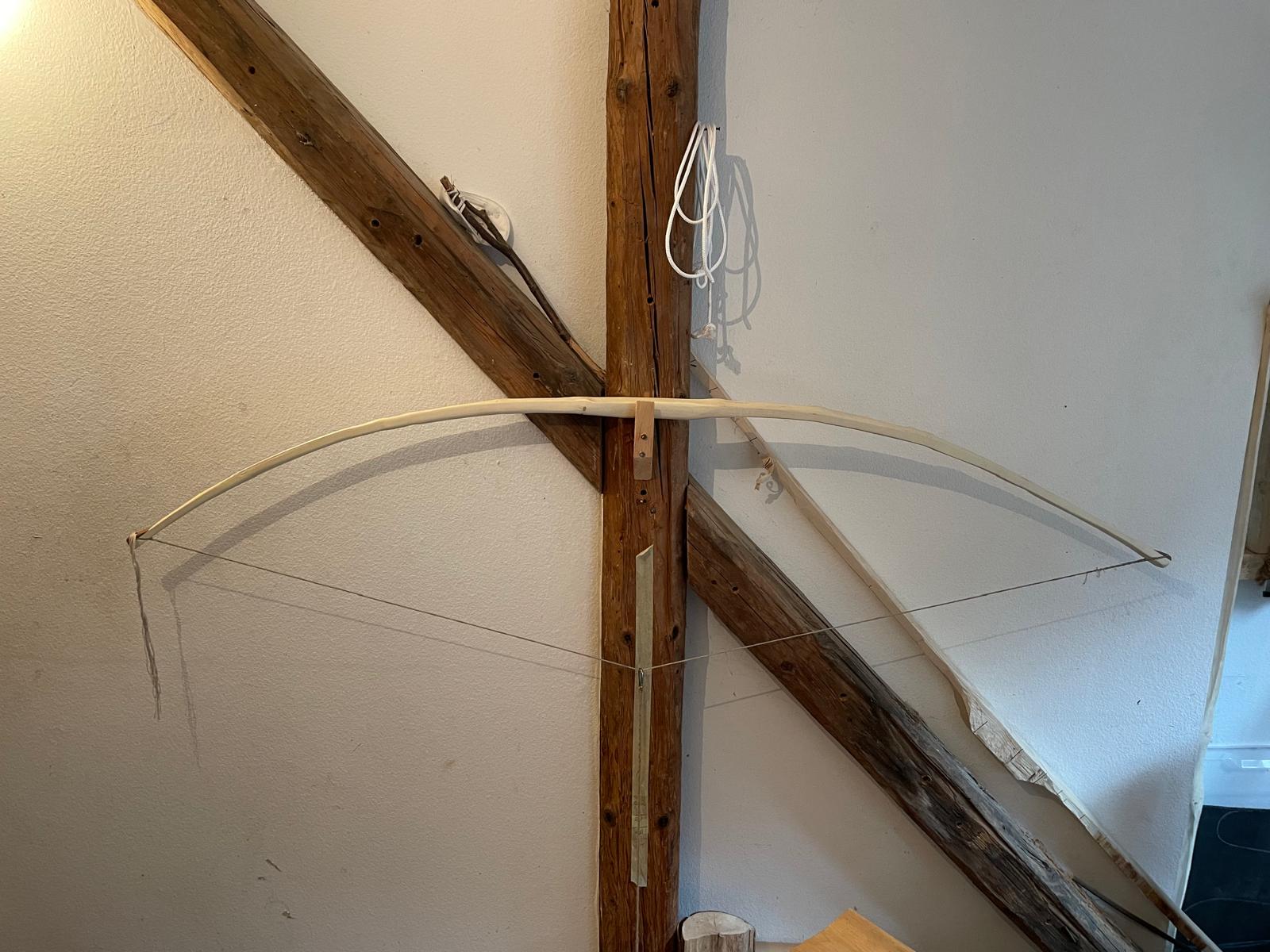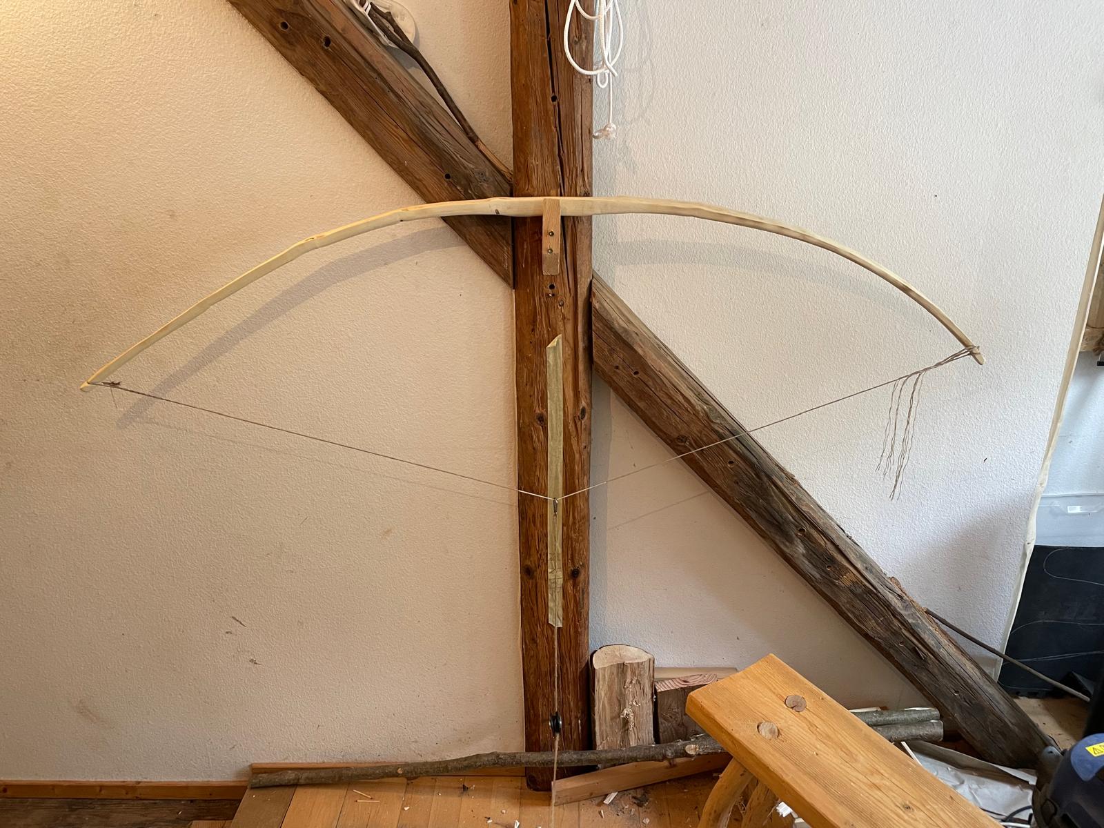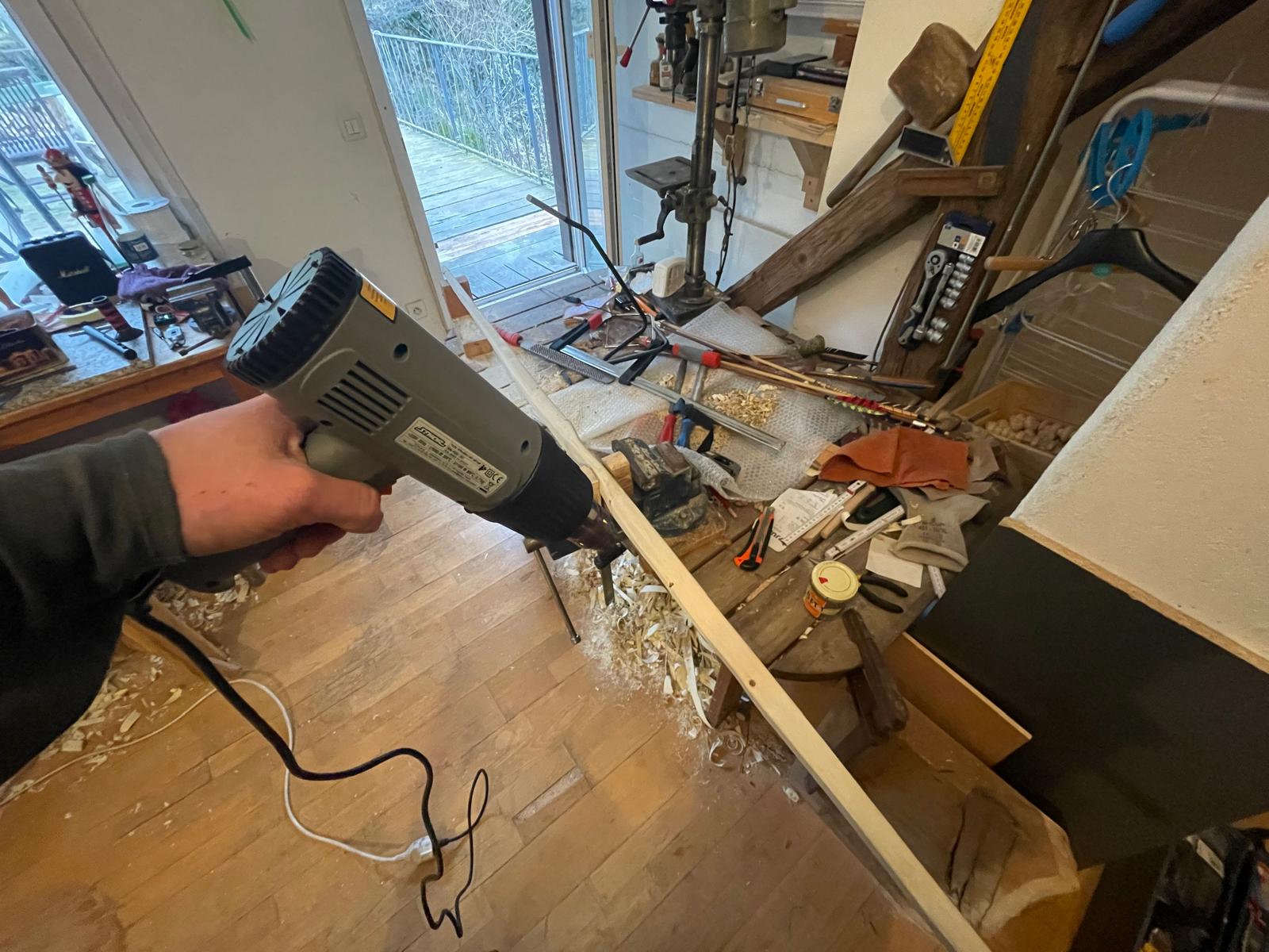 Anfangs im kalten Keller trocknen. Wenn man schnell auf Stave-Abmessungen kommt, hat man viel der Spannung aus dem Holz genommen und das Reißen wird minimiert. Nach der Arbeit den Stave auf einer Bohle fixieren, eventuell mit Unterlagen an den Enden für einen Reflex.