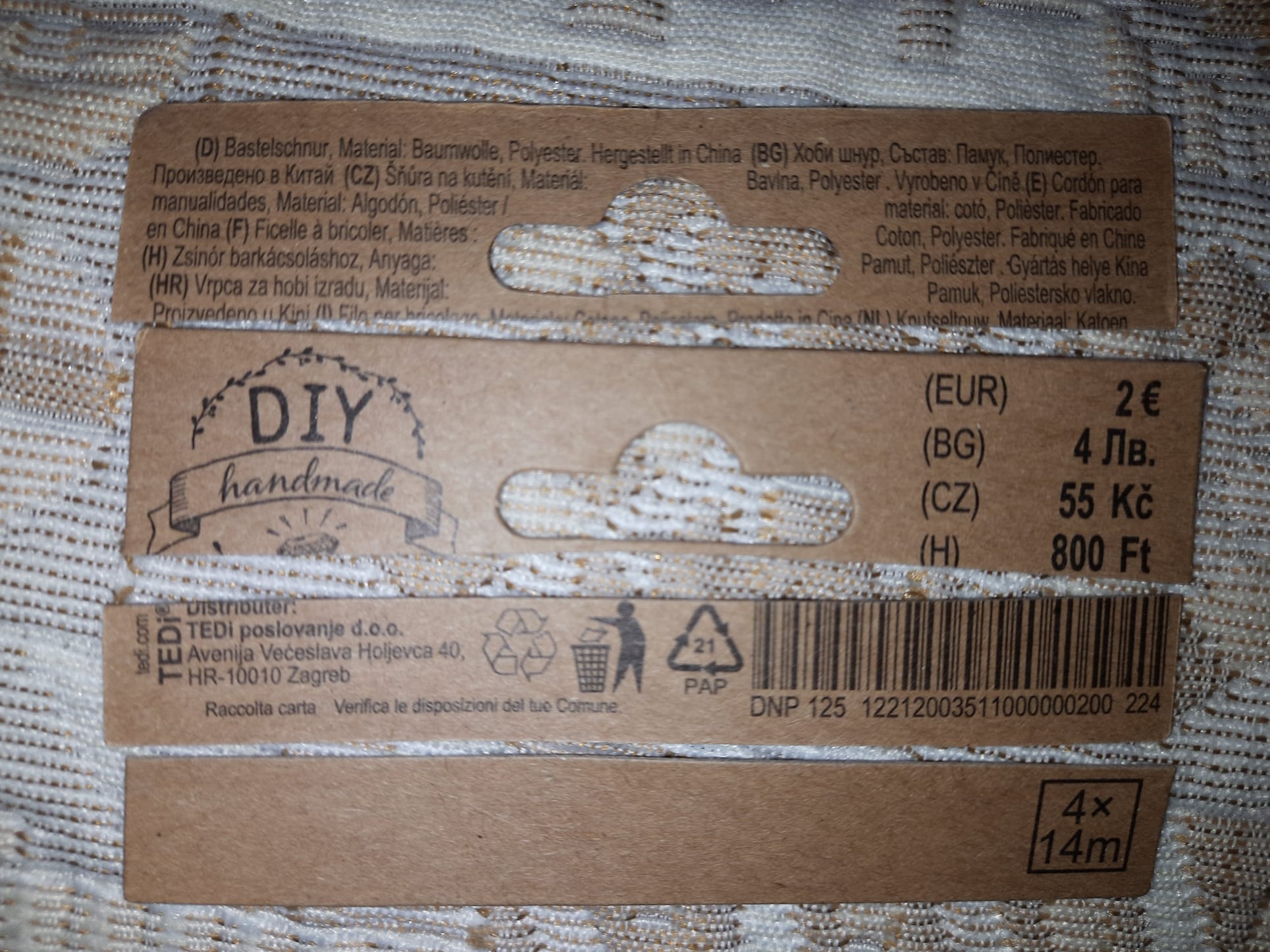 Bin heute bei Tedi fündig geworden: Bastelschnur in vier Farben, a´14 m pro Farbe. Die Schnur ist aus Baumwolle mit einem Anteil an Polyester. Habe für Mittelalterpfeile gedämpfte Farben gewählt, gibt auch noch andere.