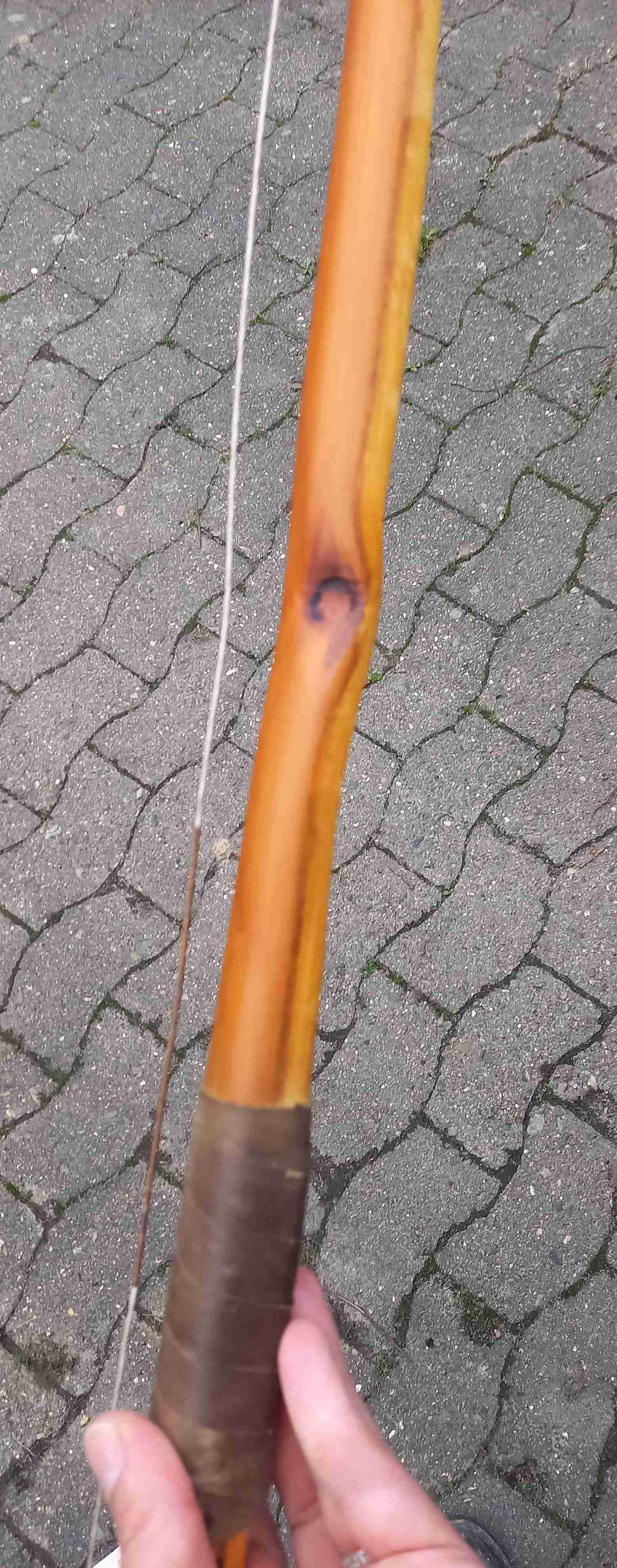 Zum Bogen (siehe auch Bilder) es handelt sich um einen ELB aus Eibe, mit Hornnocken und einer Länge von ca. 1,93m. Das Zuggewicht liegt bei ca. 45lbs@28" (ATA/AMO), der Bogen kann ohne Probleme auf >30" gezogen werden. Zwei markante Astlöcher/Knäste im unteren Wurfarm. Peckmark in "Kleeblatt"-Form. Griffwicklung wurde evtl. später angebracht. Der Vorbesitzer war vermutlich eher Mittelalterfan denn Bogenschütze und hat den Bogen womöglich vor allem als Paradewaffe auf Märkten u.ä. getragen. Ich vermute daher ferner, dass er deshalb manchmal etwas länger aufgespannt war, als nötig. Jedenfalls zeigt er bereits ein deutliches stringfollow.