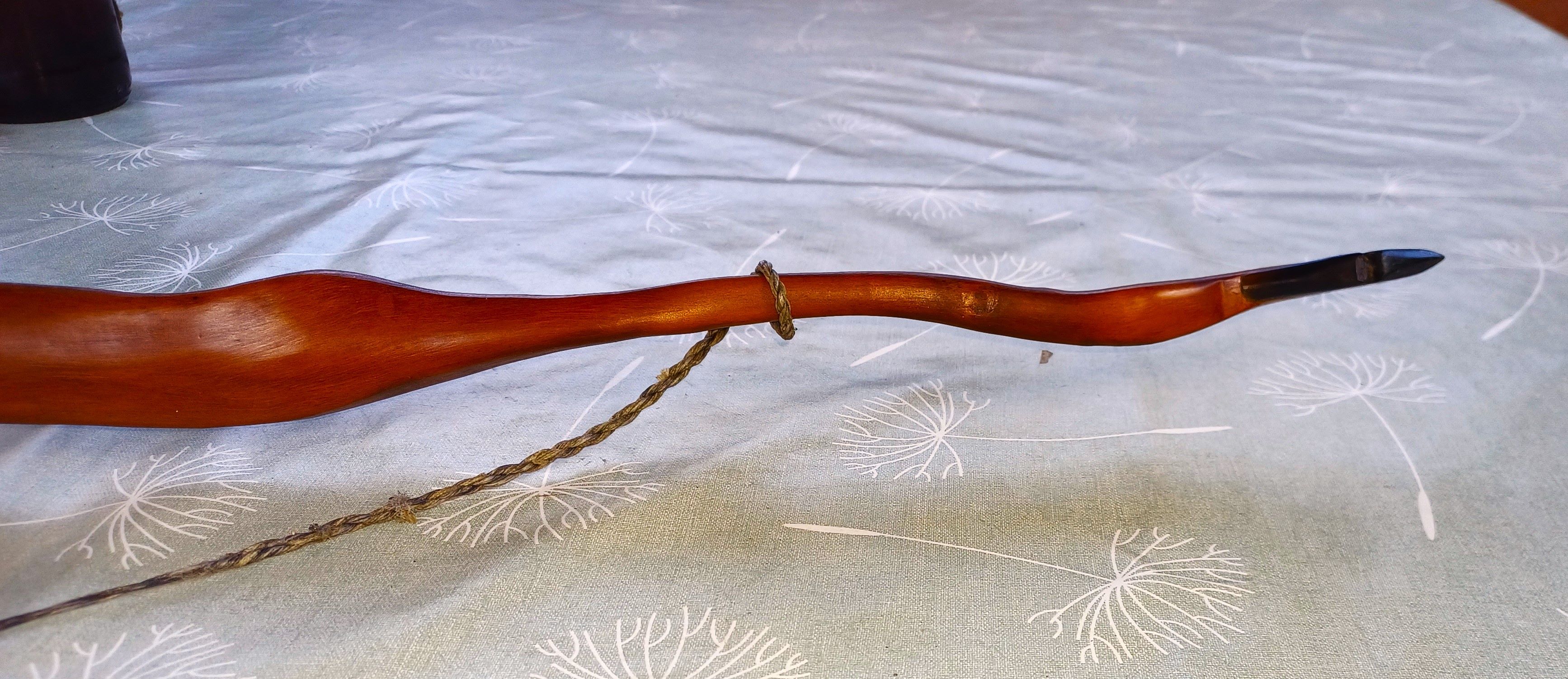 Sehne: FF, 6 Strang mit verstärkten Öhrchen, Mittenwicklung ist doppelt gewickelt: damit passen die Pfeilnocken sehr gut und die sonst sehr dünne Sehne wird etwas angenehmer beim Spannen.