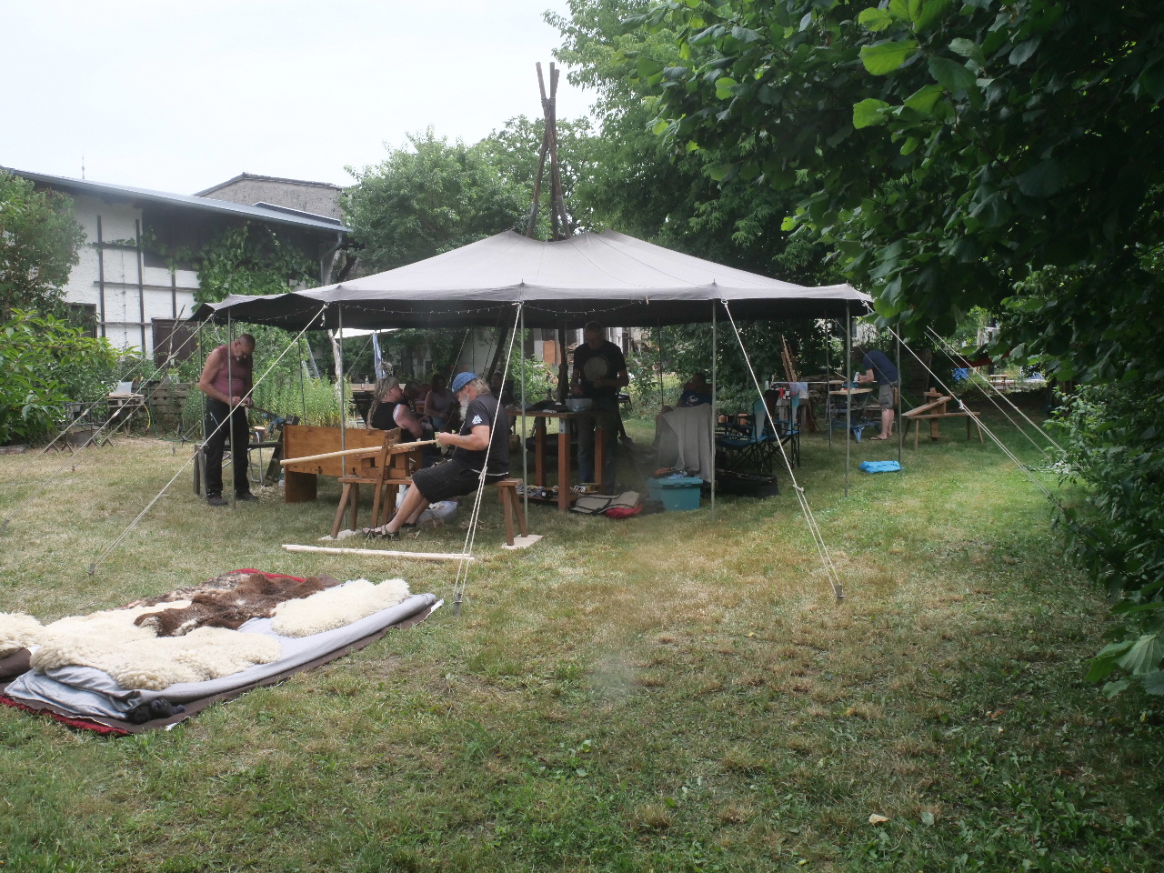 Wer es noch nicht kennt: Kai und Judith veranstalten diesen Bogenbauer-Treff schon eine ganze Reihe von Jahren, einmal jährlich. Er findet auf ihrem großen Resthof statt, diesmal mit dem großen Zeltdach einer Jurte gegen Sonne und Regen. Hier wurde dann an verschiedenen Bögen aus Hartriegel, Esche, Eibe, Ilex, Elsbeere, Glasfaser, Manau und Robinie geschnitzt. Die Damen beschäftigten sich derweil mit dem Spinnen von Wolle mit der Handspindel oder einem neu aktiviertem Spinnrad.