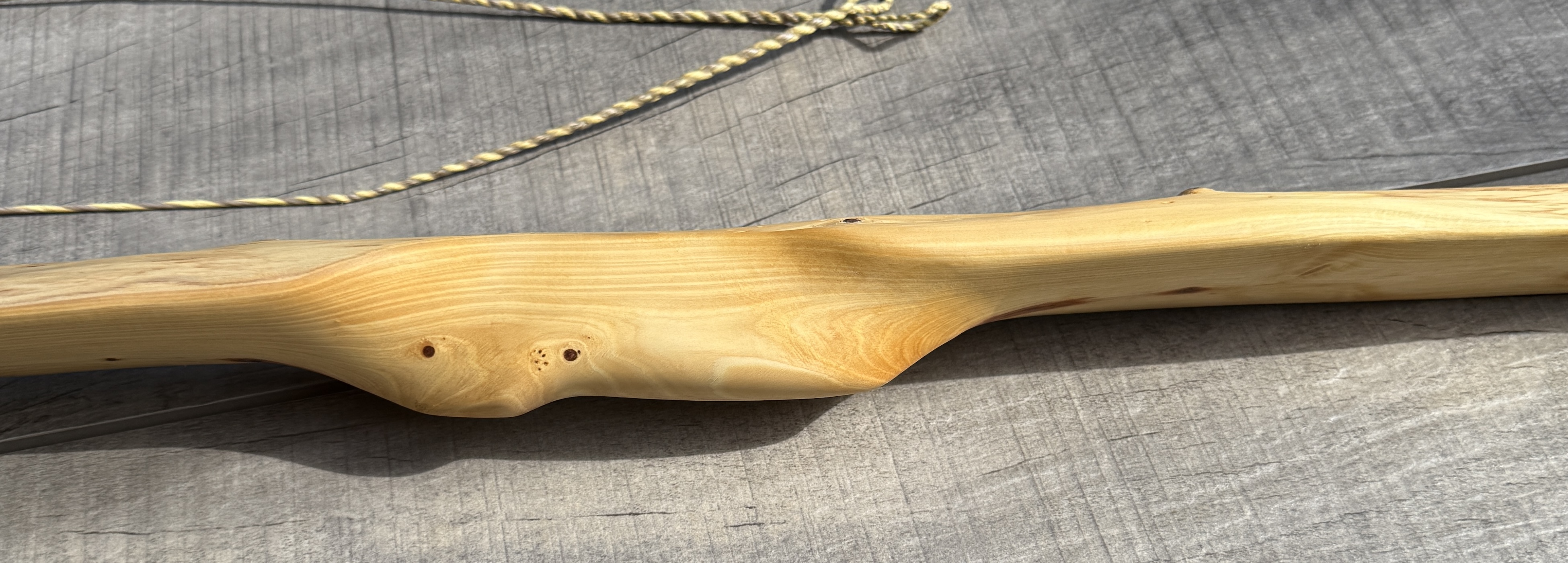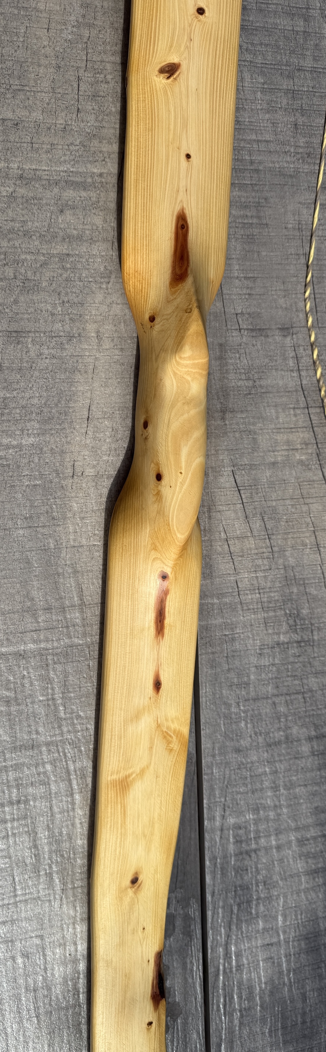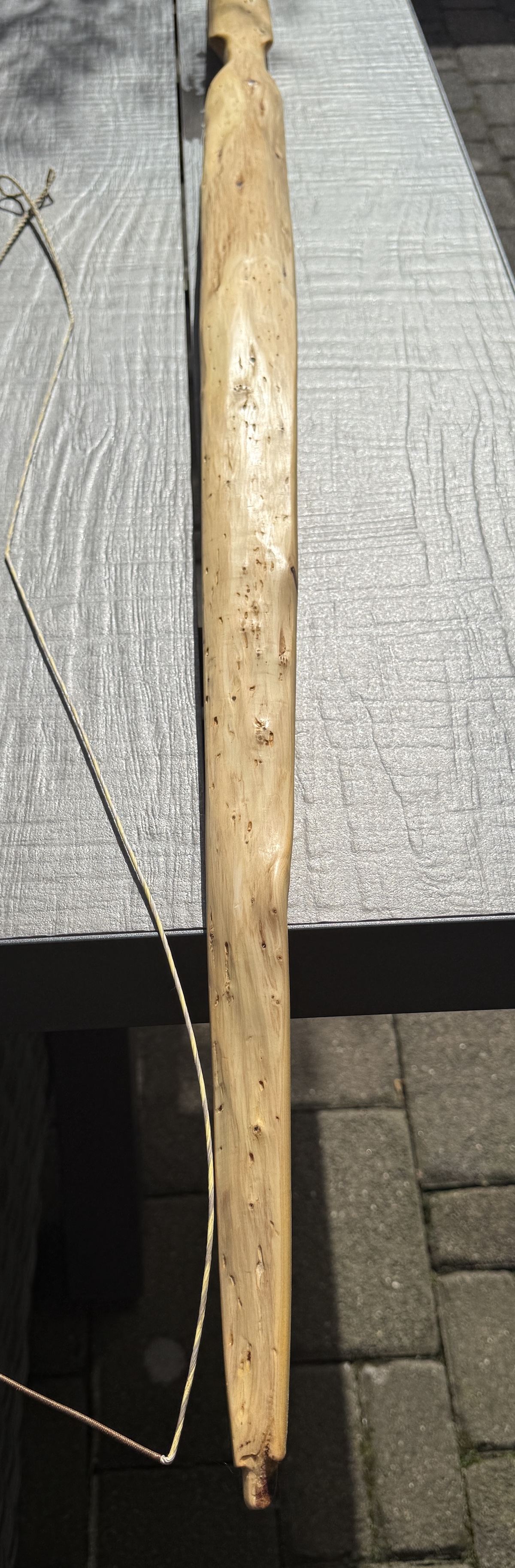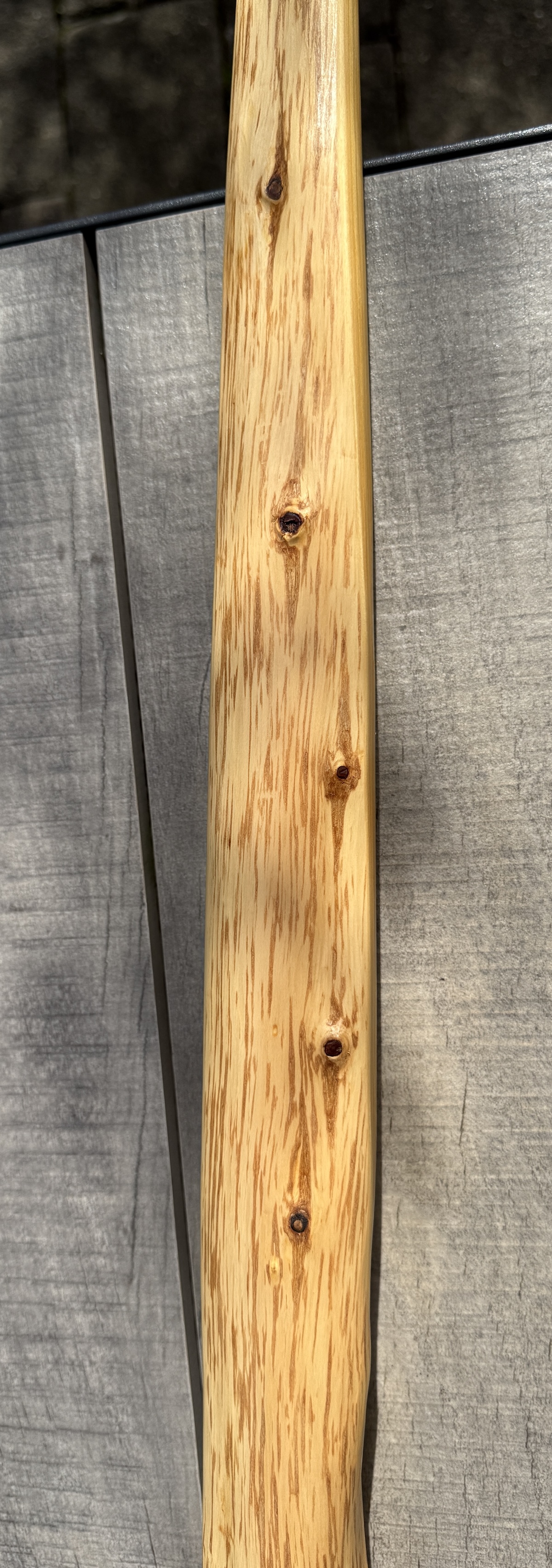 So, hier ein weiteres Exemplar aus Rocky Mountain Juniper (ich nehme das aufgrund von Hinweisen an, ohne Gewähr). Leider ist auch hier das Kernholz nur rudimentär vorhanden, dafür hatten aber einige Käfer starkes Interesse an dem Holz. Ich hab die Frassspuren nur grob mit der Ziehklinge eingeebnet, zum einen als weiteren Test für die Qualität des Holzes, zum anderen als optisches Feature. Das hier war der einzige Steve der einen leichten Knick und Äste hatte. Ausserdem habe ich noch eine Fehlstelle freigelegt. Man kann auf den Bildern noch ein paar Arbeitsspuren erkennen. Ich war da etwas schlampig, weil es wieder nur ein Testbogen ist. An den Fades 54mm, an den Nocken 19mm.