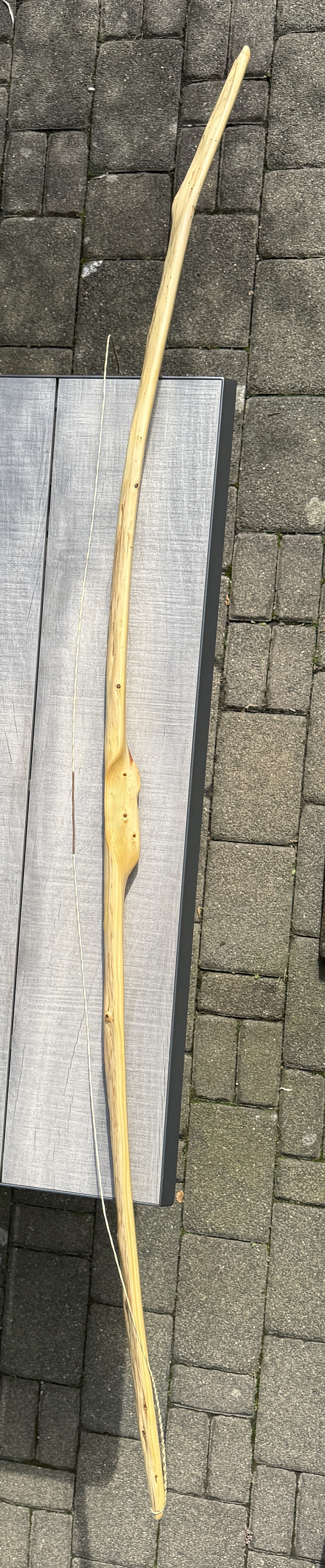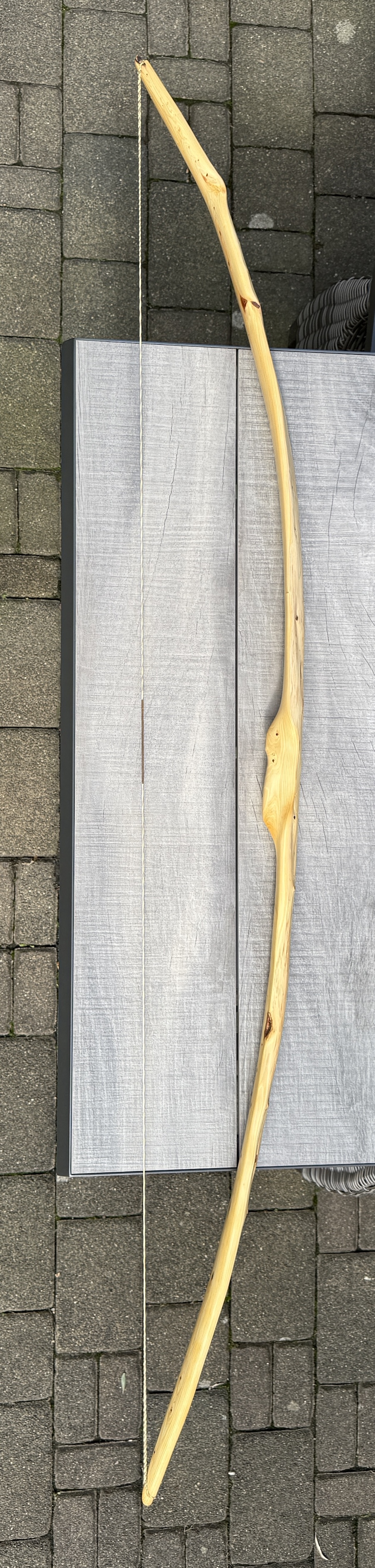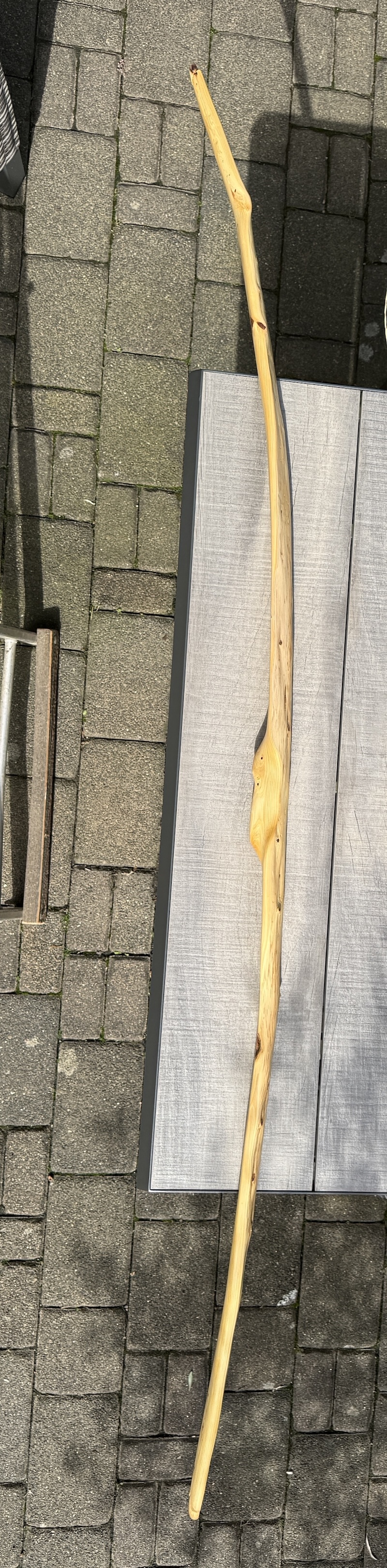 So, hier ein weiteres Exemplar aus Rocky Mountain Juniper (ich nehme das aufgrund von Hinweisen an, ohne Gewähr). Leider ist auch hier das Kernholz nur rudimentär vorhanden, dafür hatten aber einige Käfer starkes Interesse an dem Holz. Ich hab die Frassspuren nur grob mit der Ziehklinge eingeebnet, zum einen als weiteren Test für die Qualität des Holzes, zum anderen als optisches Feature. Das hier war der einzige Steve der einen leichten Knick und Äste hatte. Ausserdem habe ich noch eine Fehlstelle freigelegt. Man kann auf den Bildern noch ein paar Arbeitsspuren erkennen. Ich war da etwas schlampig, weil es wieder nur ein Testbogen ist. An den Fades 54mm, an den Nocken 19mm.