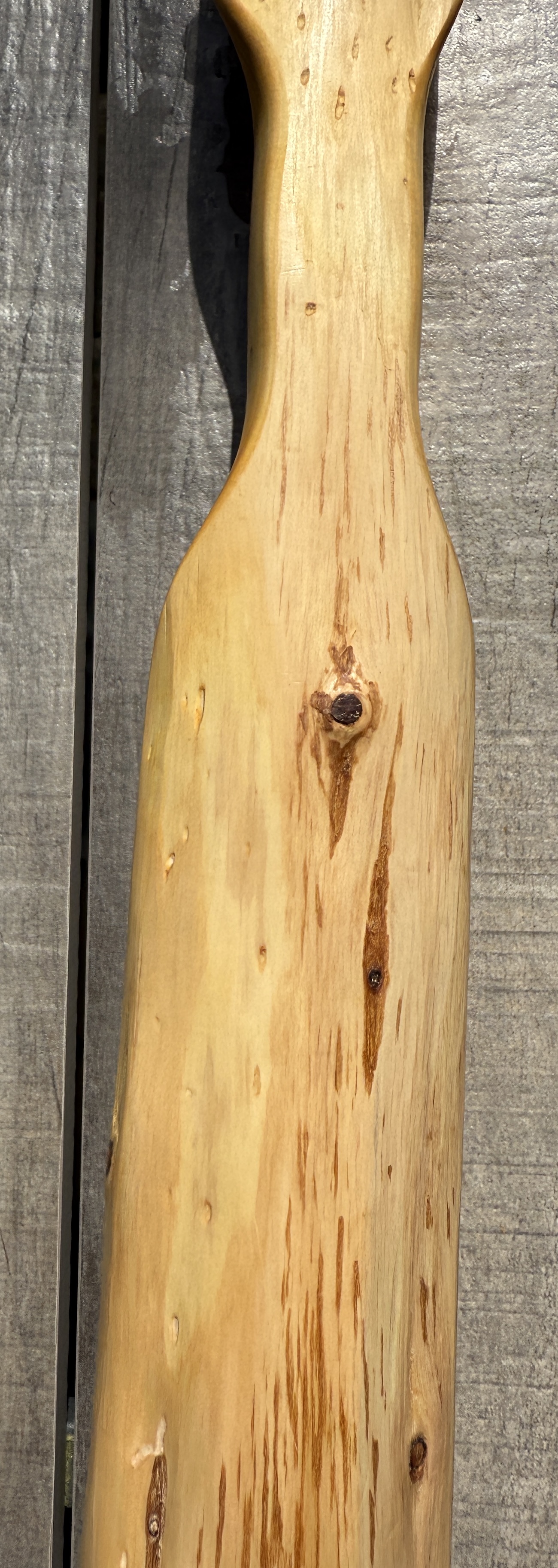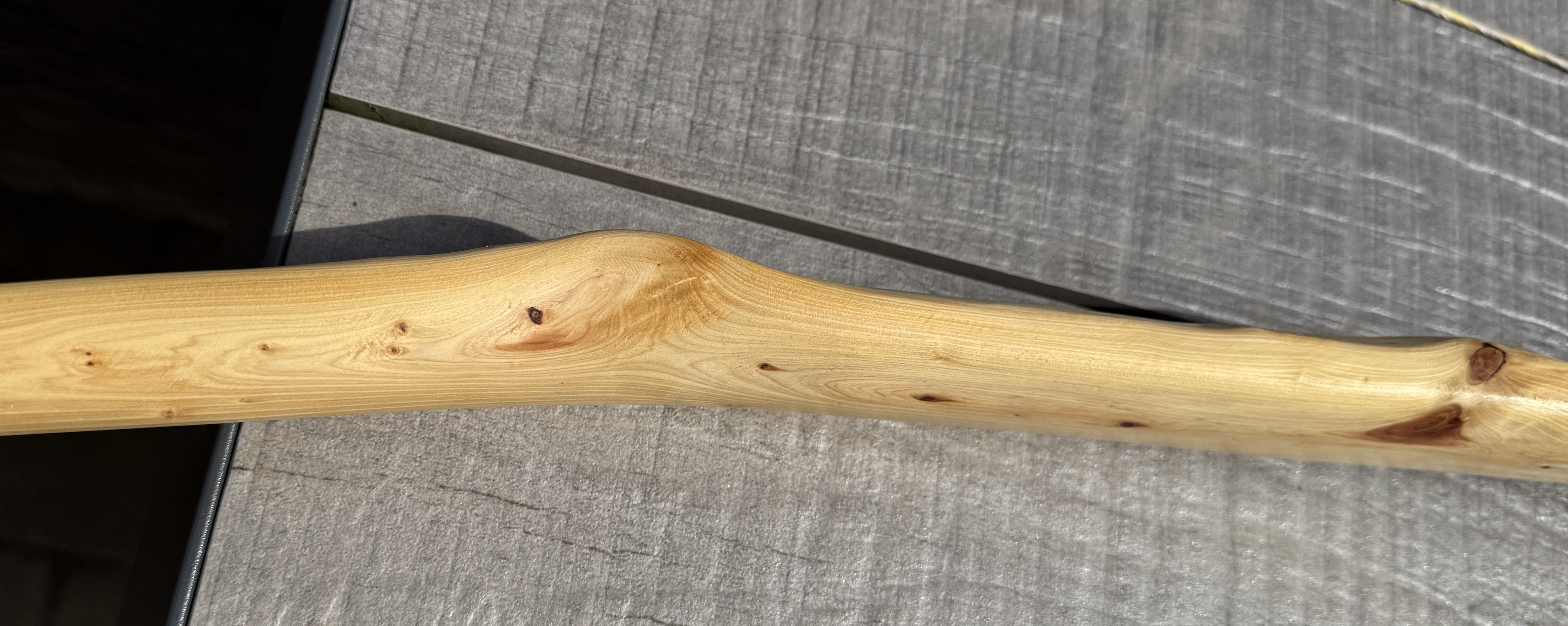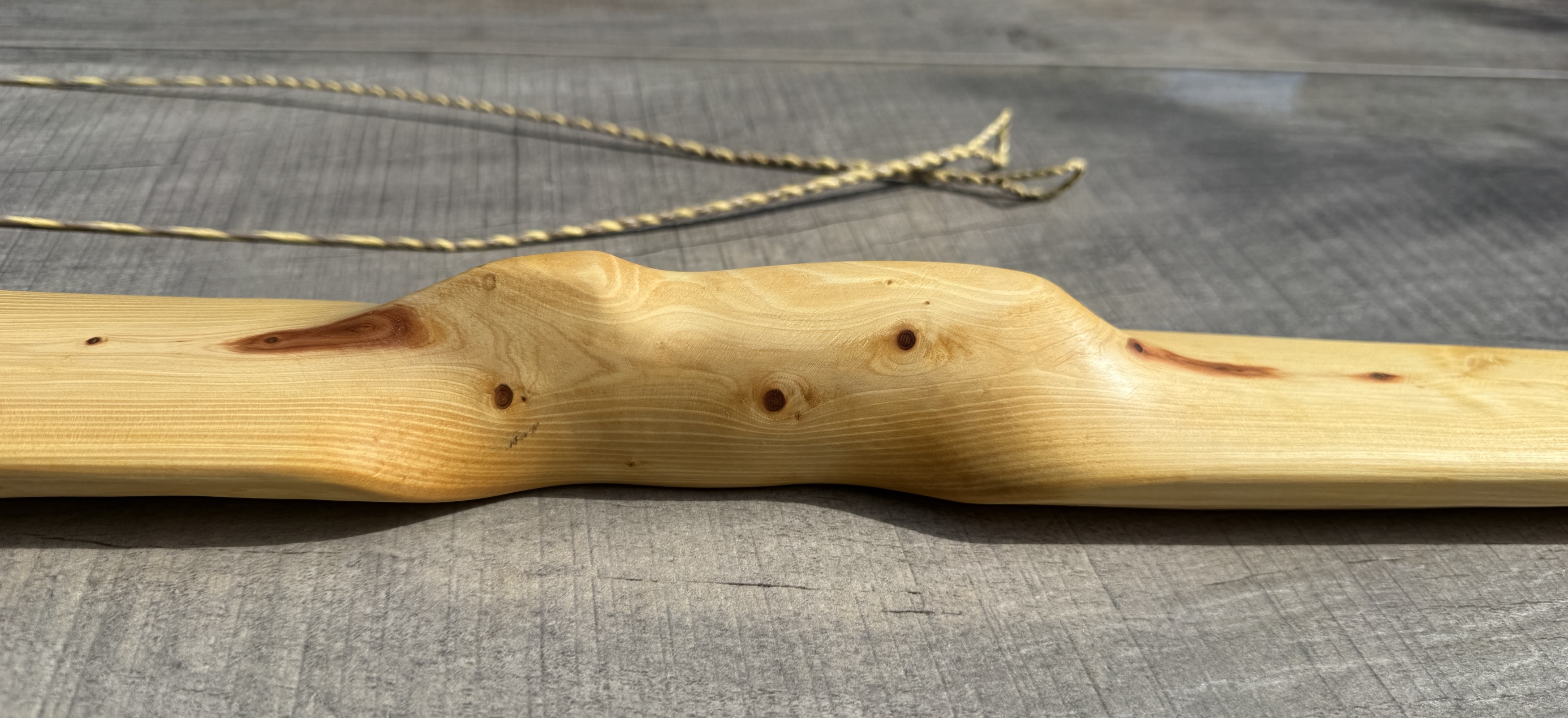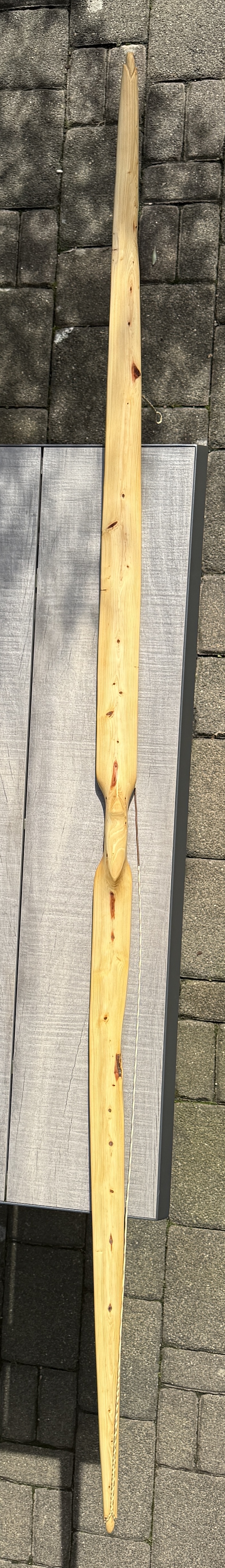 So, hier ein weiteres Exemplar aus Rocky Mountain Juniper (ich nehme das aufgrund von Hinweisen an, ohne Gewähr). Leider ist auch hier das Kernholz nur rudimentär vorhanden, dafür hatten aber einige Käfer starkes Interesse an dem Holz. Ich hab die Frassspuren nur grob mit der Ziehklinge eingeebnet, zum einen als weiteren Test für die Qualität des Holzes, zum anderen als optisches Feature. Das hier war der einzige Steve der einen leichten Knick und Äste hatte. Ausserdem habe ich noch eine Fehlstelle freigelegt. Man kann auf den Bildern noch ein paar Arbeitsspuren erkennen. Ich war da etwas schlampig, weil es wieder nur ein Testbogen ist. An den Fades 54mm, an den Nocken 19mm.