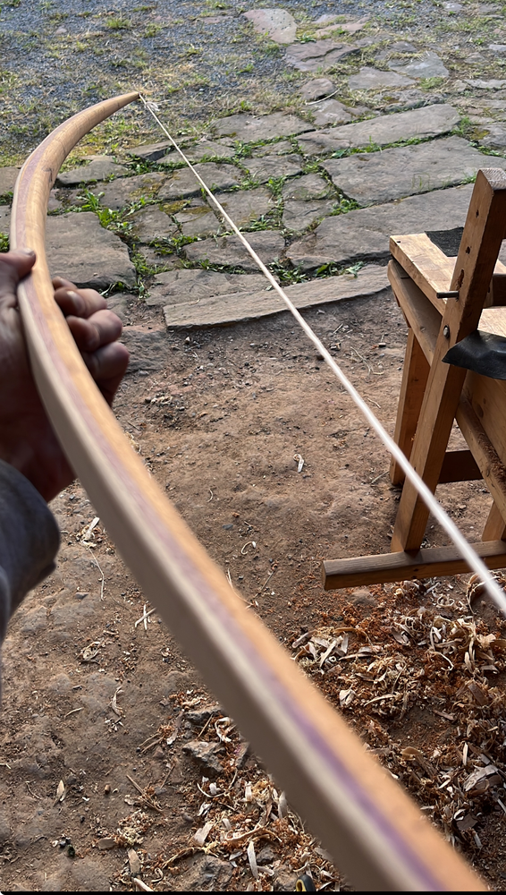 Allerdings hat es eine unglaubliche Rückstellkraft, was auch der Grund ist, warum es sowohl im Zug als auch im Druckbereich liegt. Gesichert am Rücken durch Hickory und entlastet am Bauch durch eine harte Eibe, die aufgrund ihrer 'drucktoleranz' das Holz der Wahl ist.