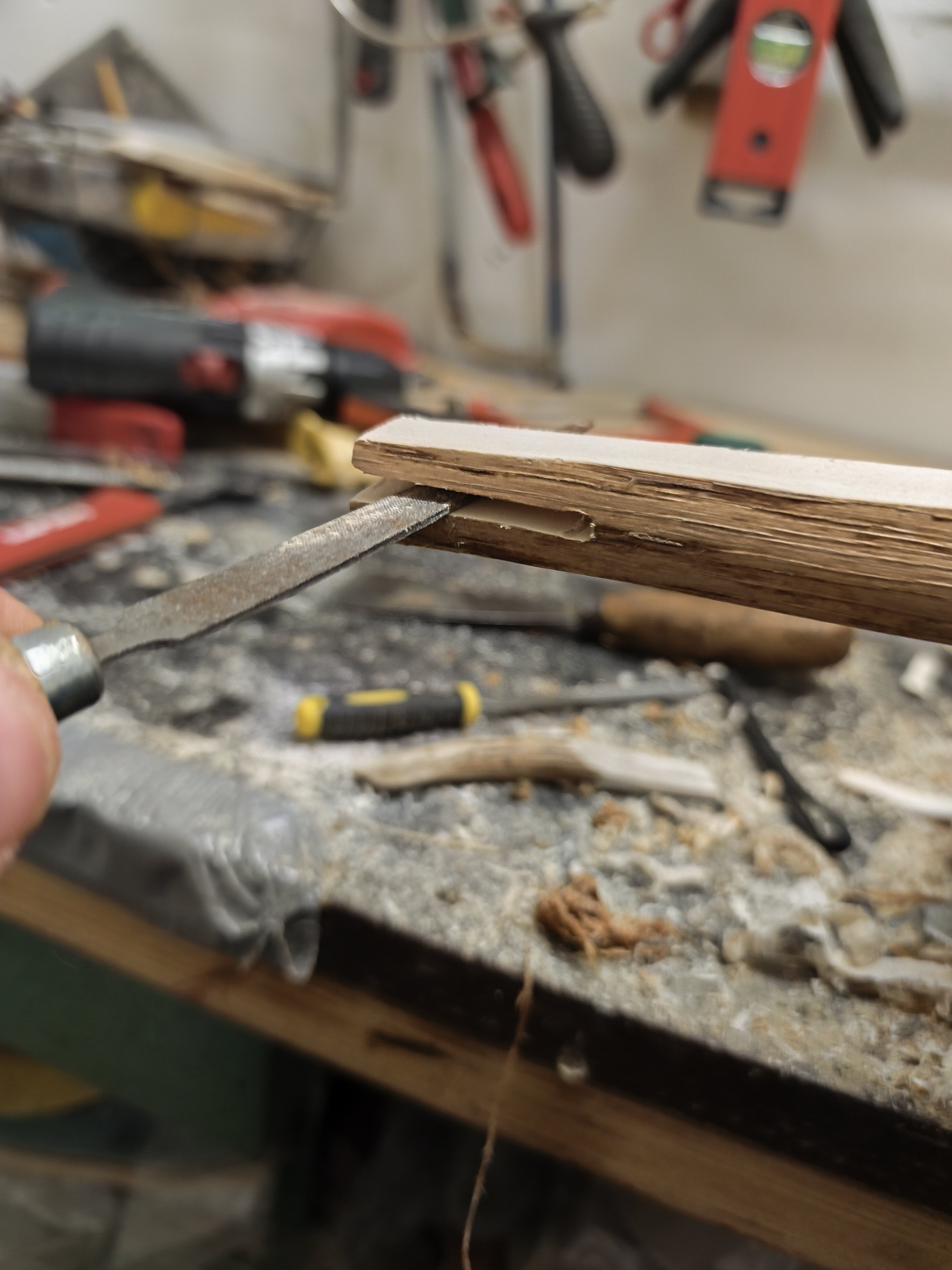 Kleine Waldelfen, die versuchen, unter dem Bast Schneeflocken ins Holz zu schnitzen?