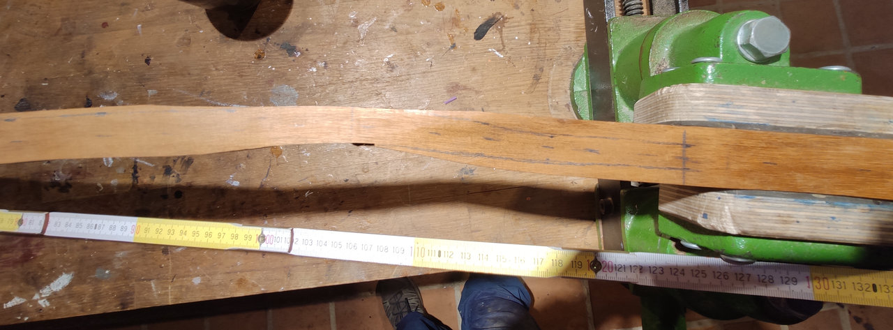 Wenn ich die beiden schmalen Stellen (16mm) nicht im Haupt-Biegebereich der WA haben möchte, dann kürze ich den Bogen einseitig um 25 cm; dann liegen die schmalen Stellen 15cm vor dem Bogenende. Dann ist der Bogen aber nur noch gute 115cm lang...