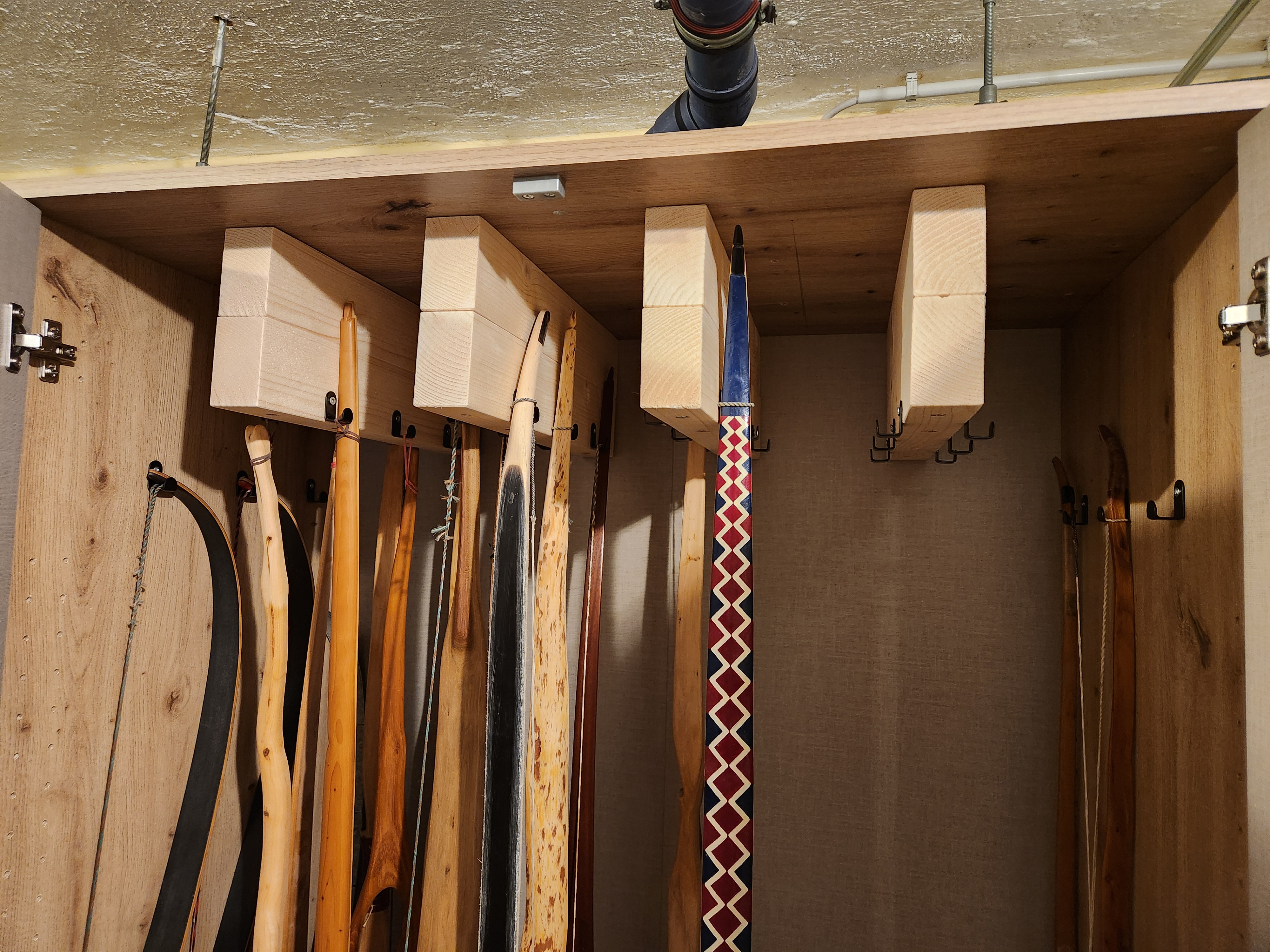 Ich hab grad ein neues Projekt in Angriff genommen weil mir der Platz für meine Bögen langsam knapp wurde und wir im Herbst auch noch renoviert haben wobei mir mein ursprünglicher Bogenplatz verloren ging. Außerdem sind sie auf ihrem alten Platz (in meiner Werkstatt) dauernd eingestaubt.