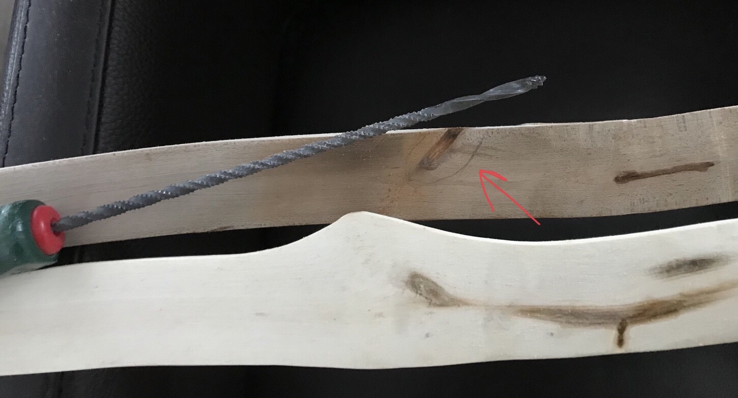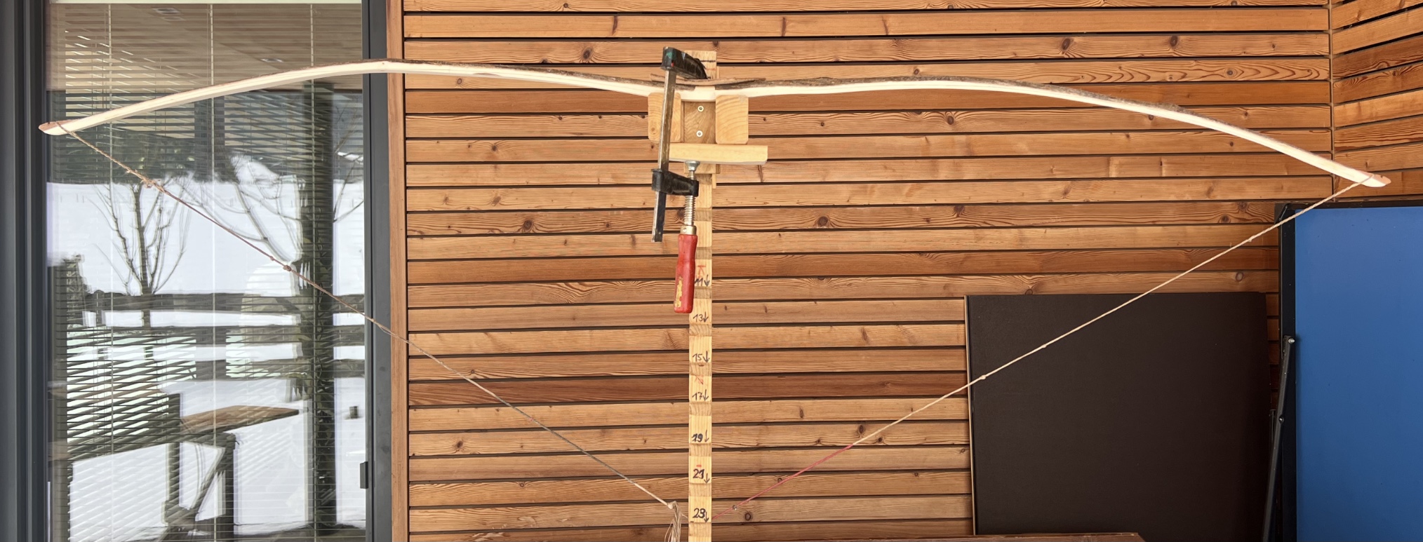 Der Plan: die beiden Bögen des Doppelbogen werden getrennt getillert und dann erst im Griffbereich mit Epoxy zusammen geklebt. Dann verschmälere ich den Griffbereich und werde mit Sternzwirn wickeln, zuletzt alles mit Epoxy tränken. Der Vorteil des langen vorderen Bogens ist meiner Meinung nach der immer fast rechte Winkel der Verbindungssehne. Beim Penobscot Bogen ist der Sehnenwinkel der Verbindungssehne weit über 90 Grad und der Winkel nimmt im Auszug noch zu. Es stärkt eigentlich nur die Zugseite. Am Bauch verstärken sich aber dadurch die Druckkräfte. Bei den meisten Hölzern ist aber ohnehin der unter Druck gesetzte Bauch schwächer als der auf Zug belastete Rücken.