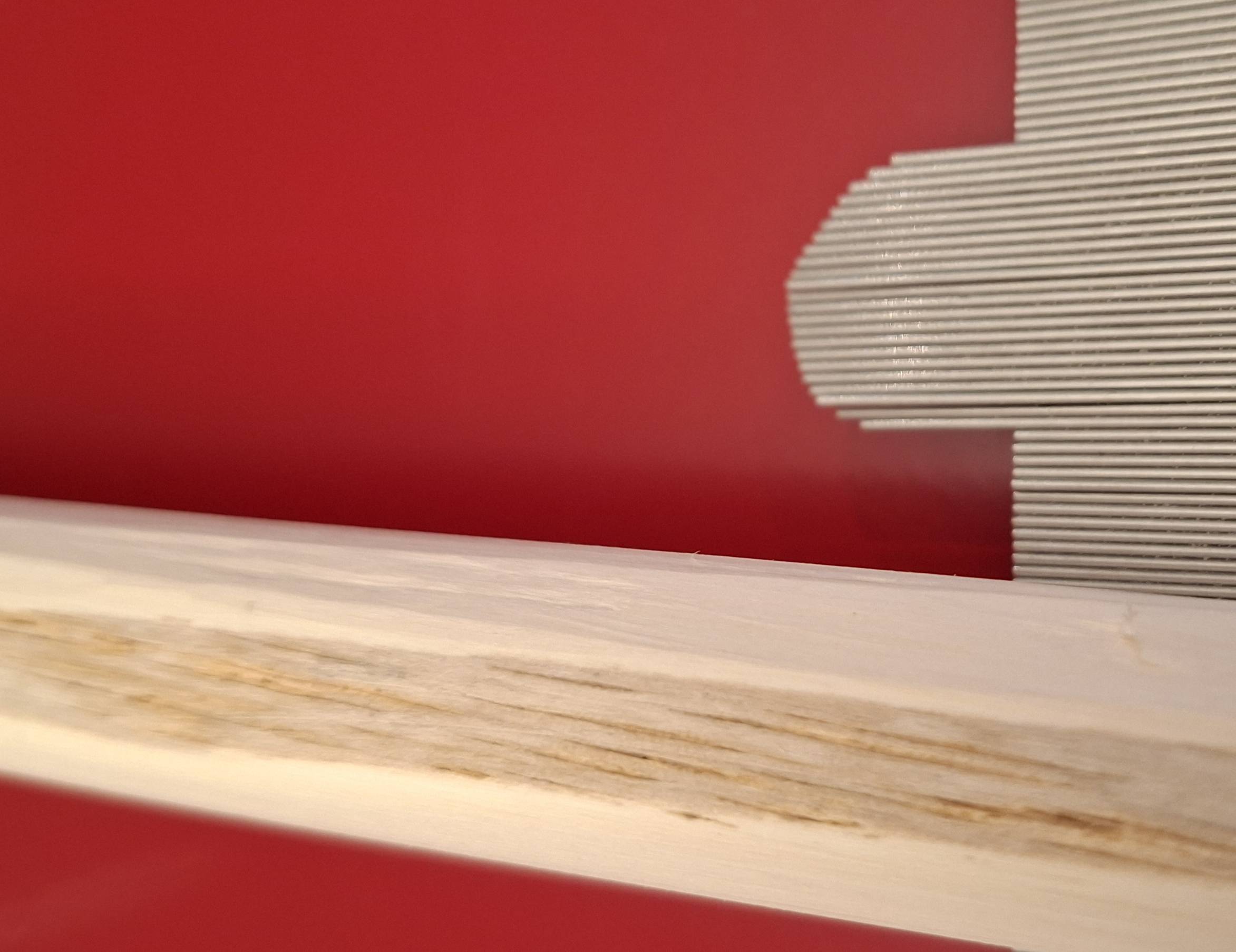 Genau so war es auch. Beim kleben des Backings hatte ich es nicht geschafft den Scheitelpunkt der Wölbung des Backings mittig auf dem Konstrukt zu platzieren. Deswegen und weil das Backing eben nicht gerade war, war der Rücken auf einer Seite deutlich höher als auf der anderen, in kurzen Bereichen aber auch auf der anderen Seite.