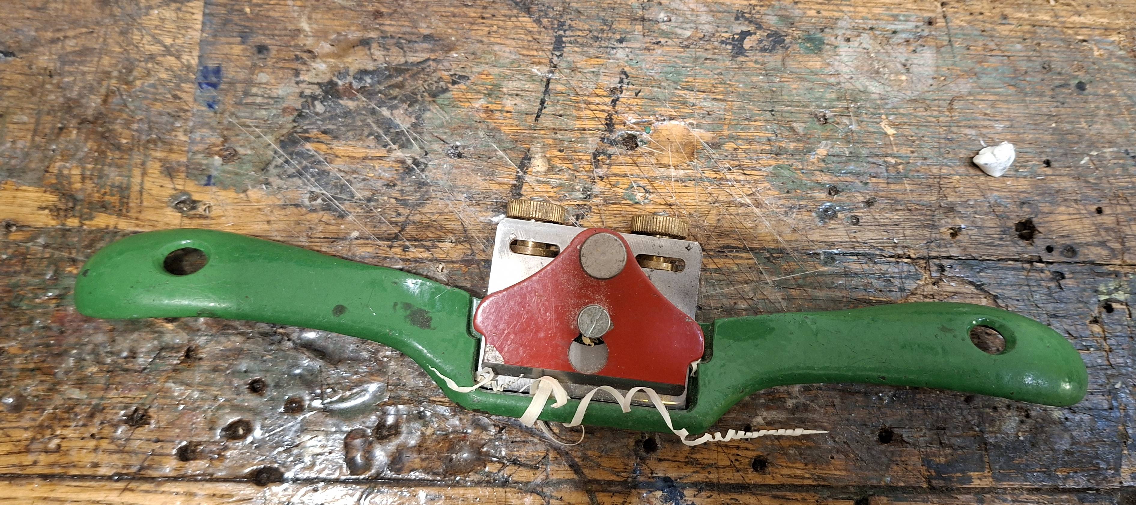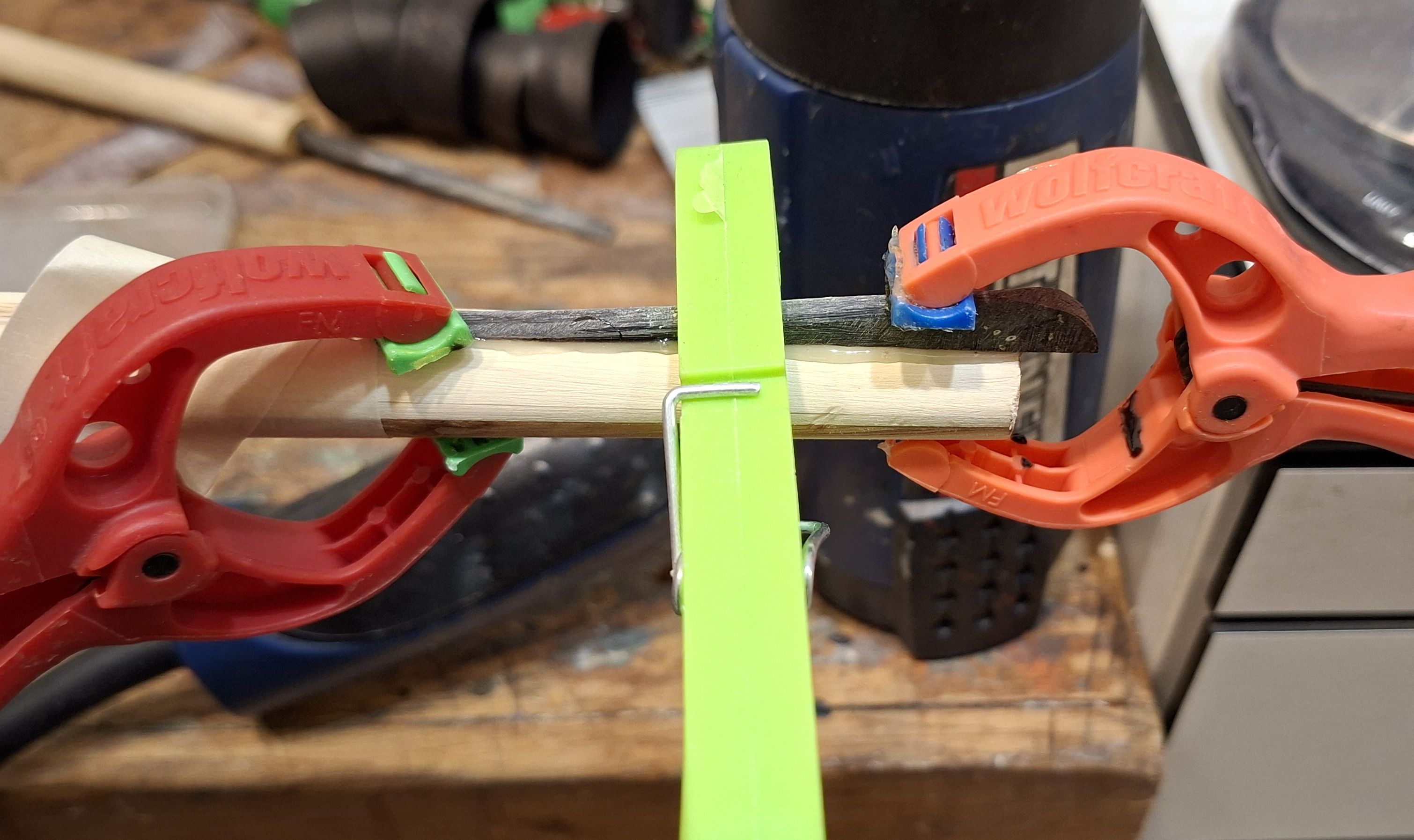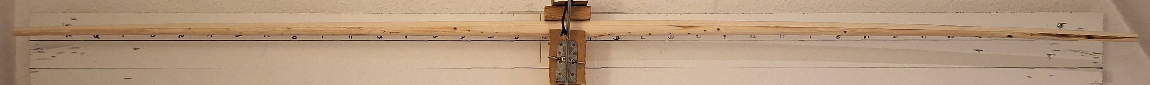 Beim ersten aufspannen hatte ich eine seitliche Abweichung der "Sehne" von deutlich über 10 cm. Ich musste allerdings nicht lange überlegen, wo Holz weg muss, da es durch den schiefen Rücken und die sichtbare Klebefuge relativ einfach war, die Unterschiede in der Dicke gut zu erkennen. Ich hatte zunächst zwar überlegt bauchseitig Holz abzutragen, ein Abtrag am Rücken erschien dann aber deutlich sinnvoller zu sein. Also habe ich alle entsprechenden Bereiche markiert und mit einem Schweifhobel abgetragen. Zunächst einfach ein paar mal am abgespannten Objekt, danach am aufgespannten Konstrukt.