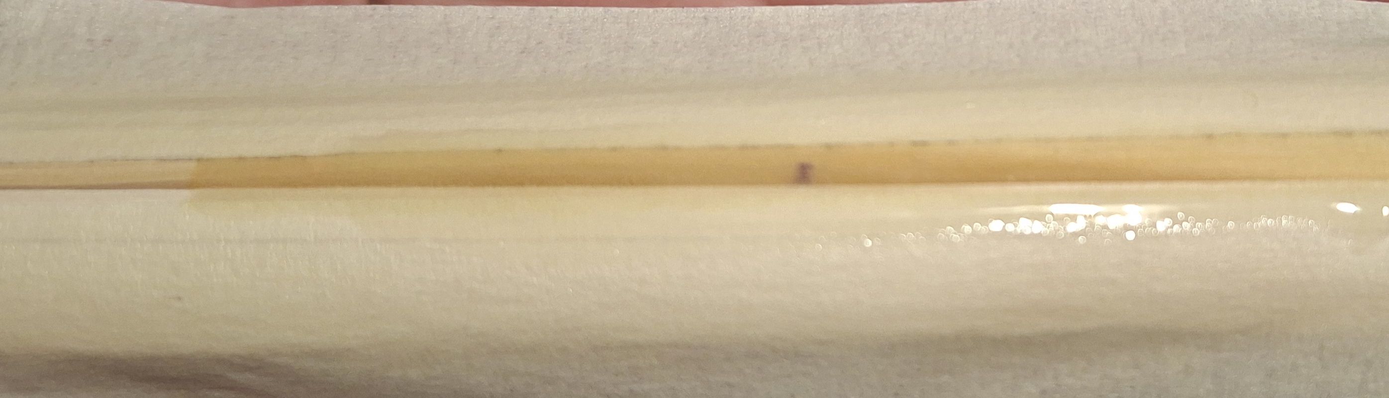 Wie dem auch sei, der schwächere WA hatte im Backing eine Schwachstelle, welche ich mit einem kleinen Haselstückchen aufgedoppelt (ca. 1,2 mm dick) und dann mit dem guten Gruschwitz Leinenzwirn gewickelt habe.