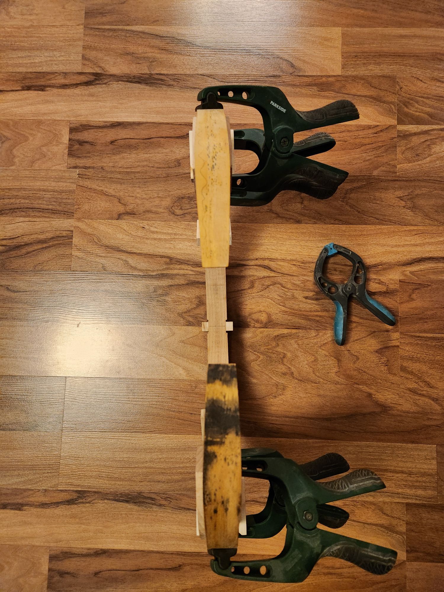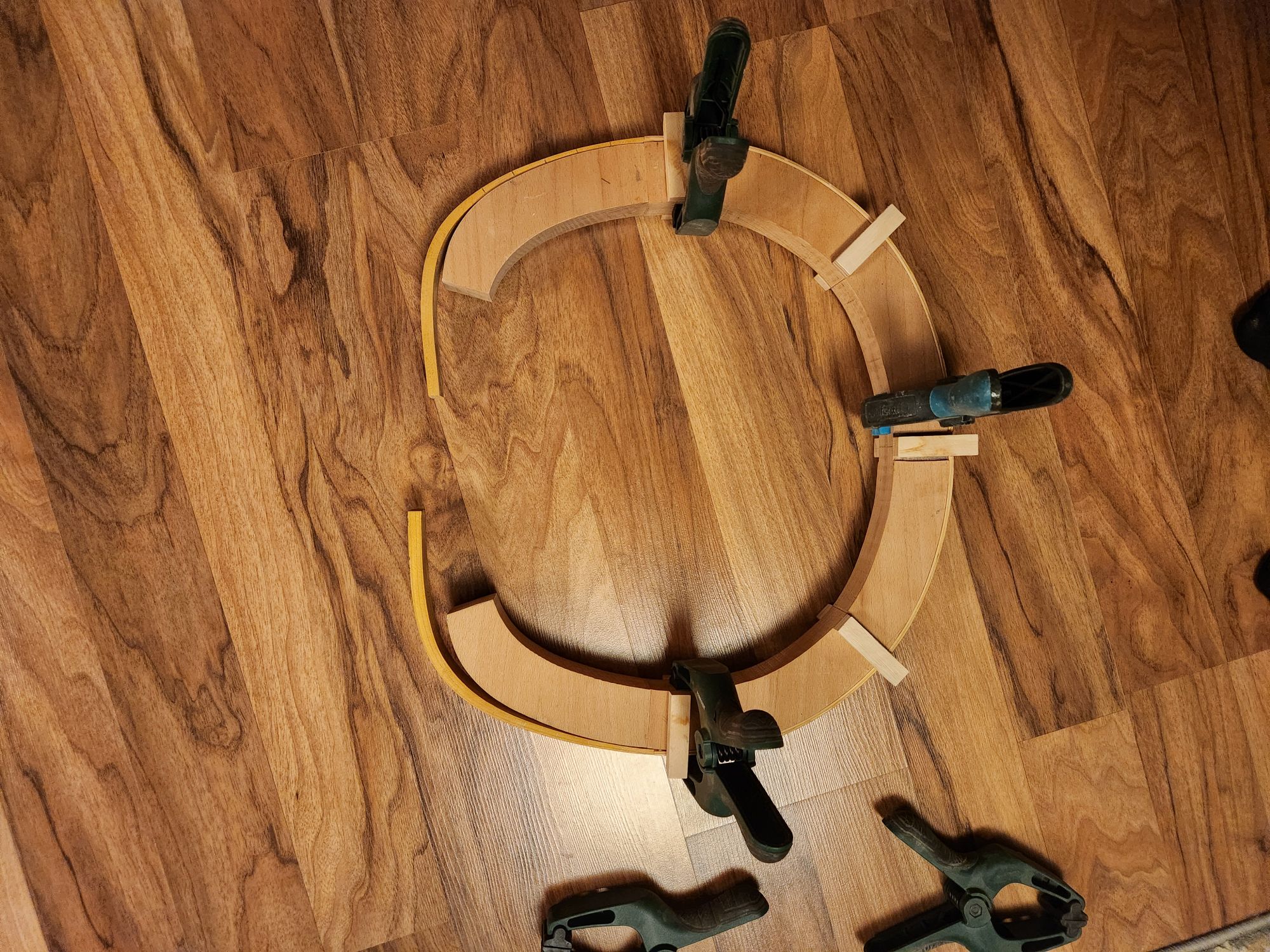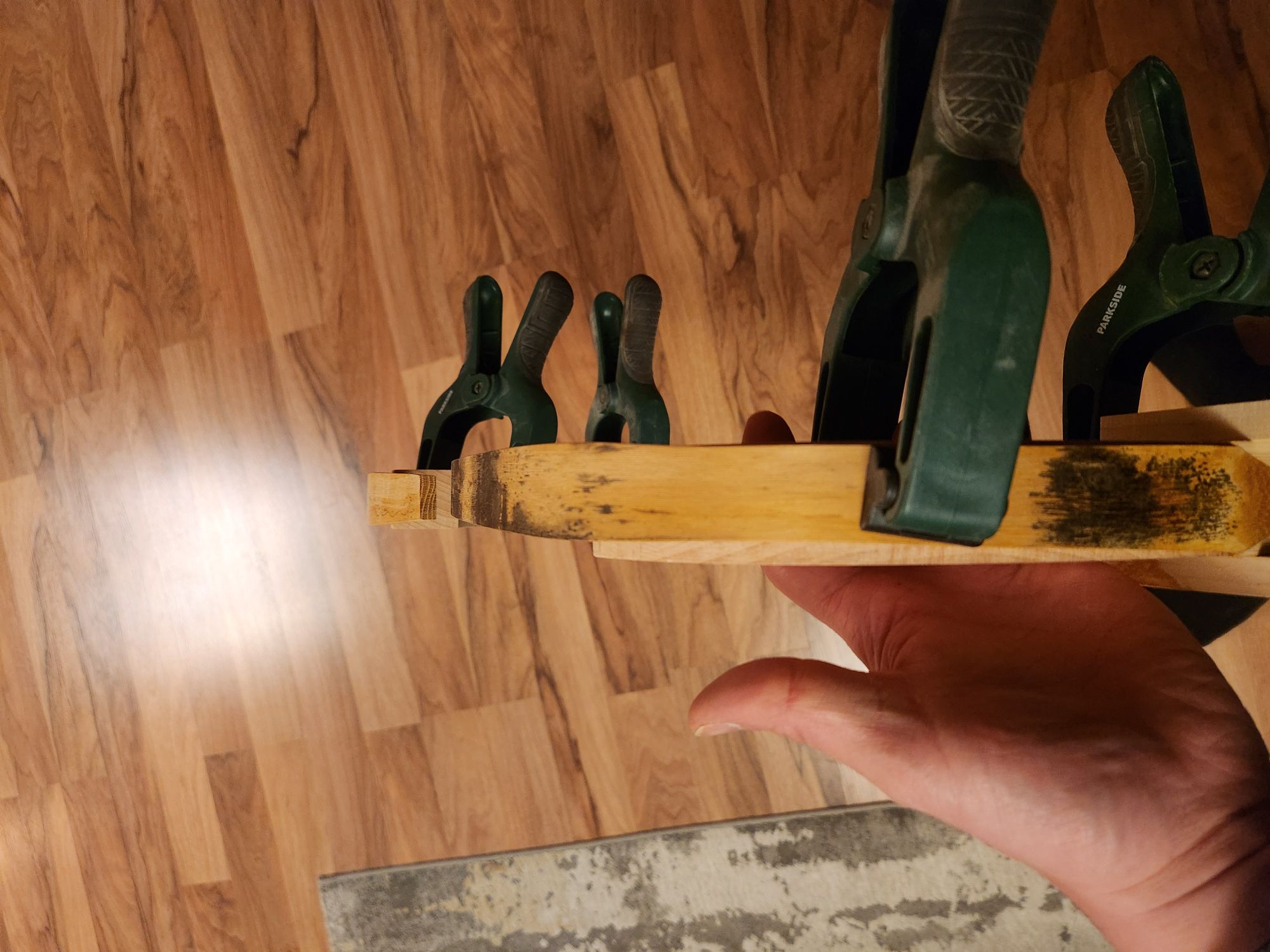Hickory ist tatsächlich um die hälfte schwerer. Schade, das hätte es mir nämlich viel einfacher gemacht, an gutes Material zu kommen... Die Laminate sind nicht ganz 6mm dick. Da wäre jetzt mein Plan immer 2 Laminate gedämpft über einander in die Form zu biegen und dann mit einander zu verkleben.
