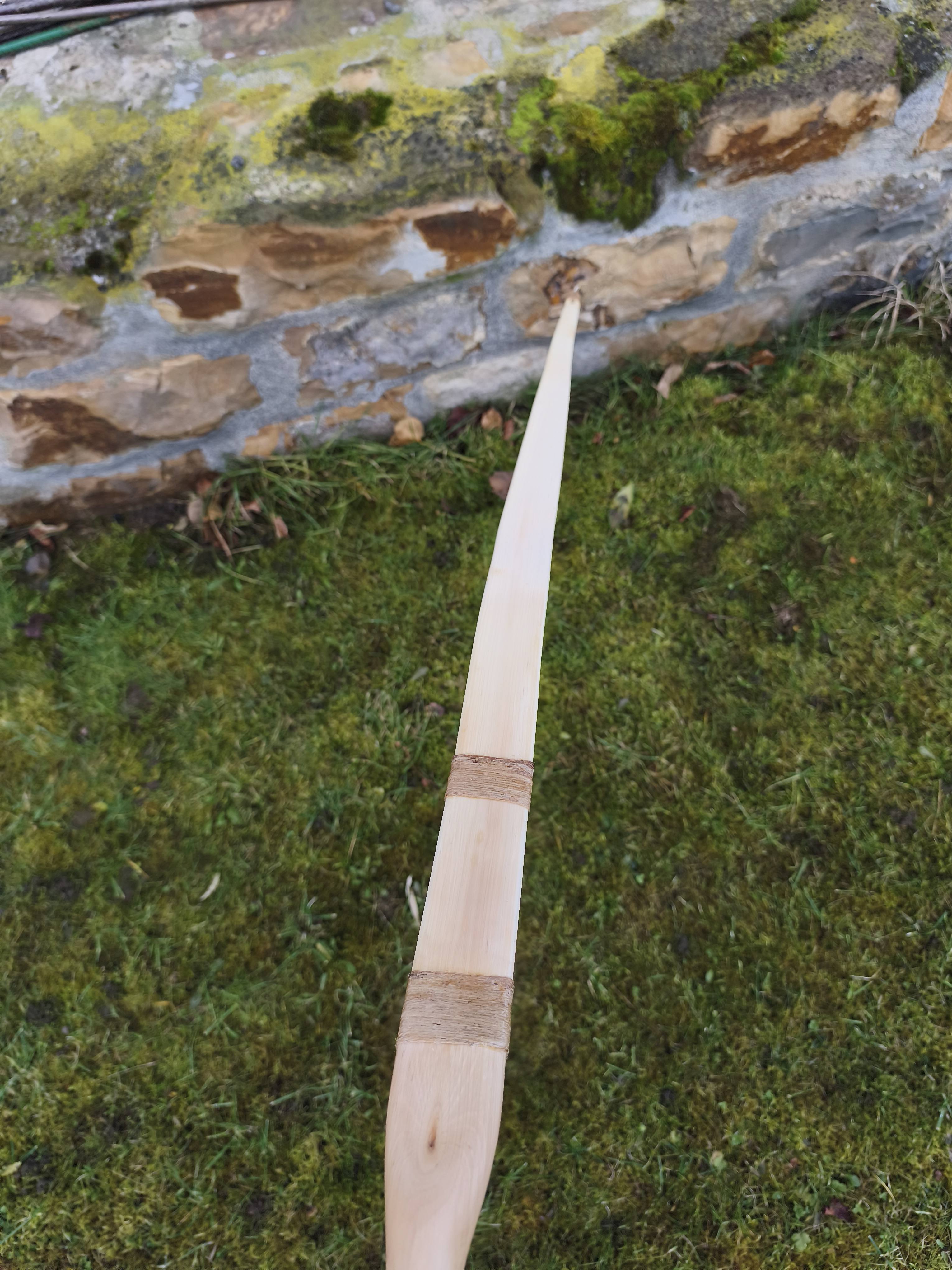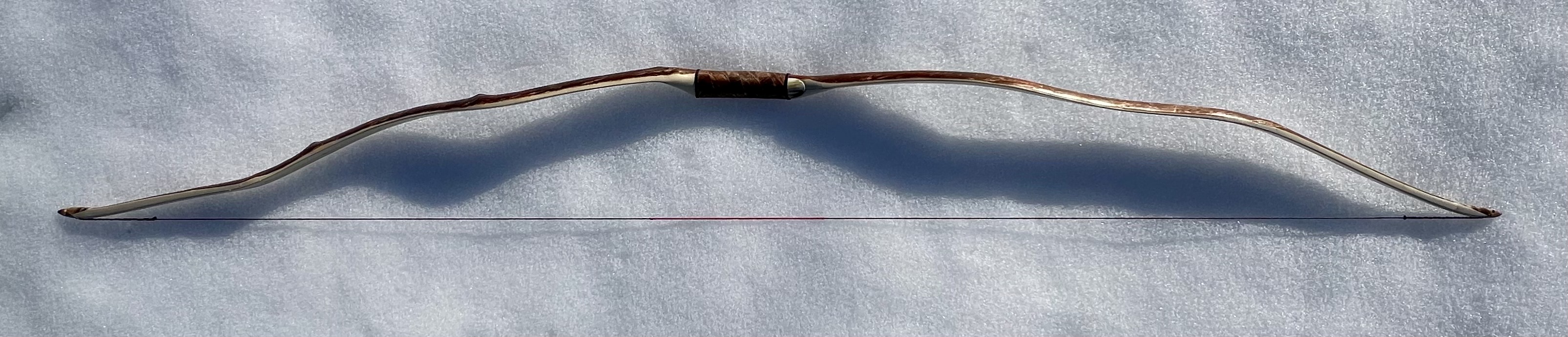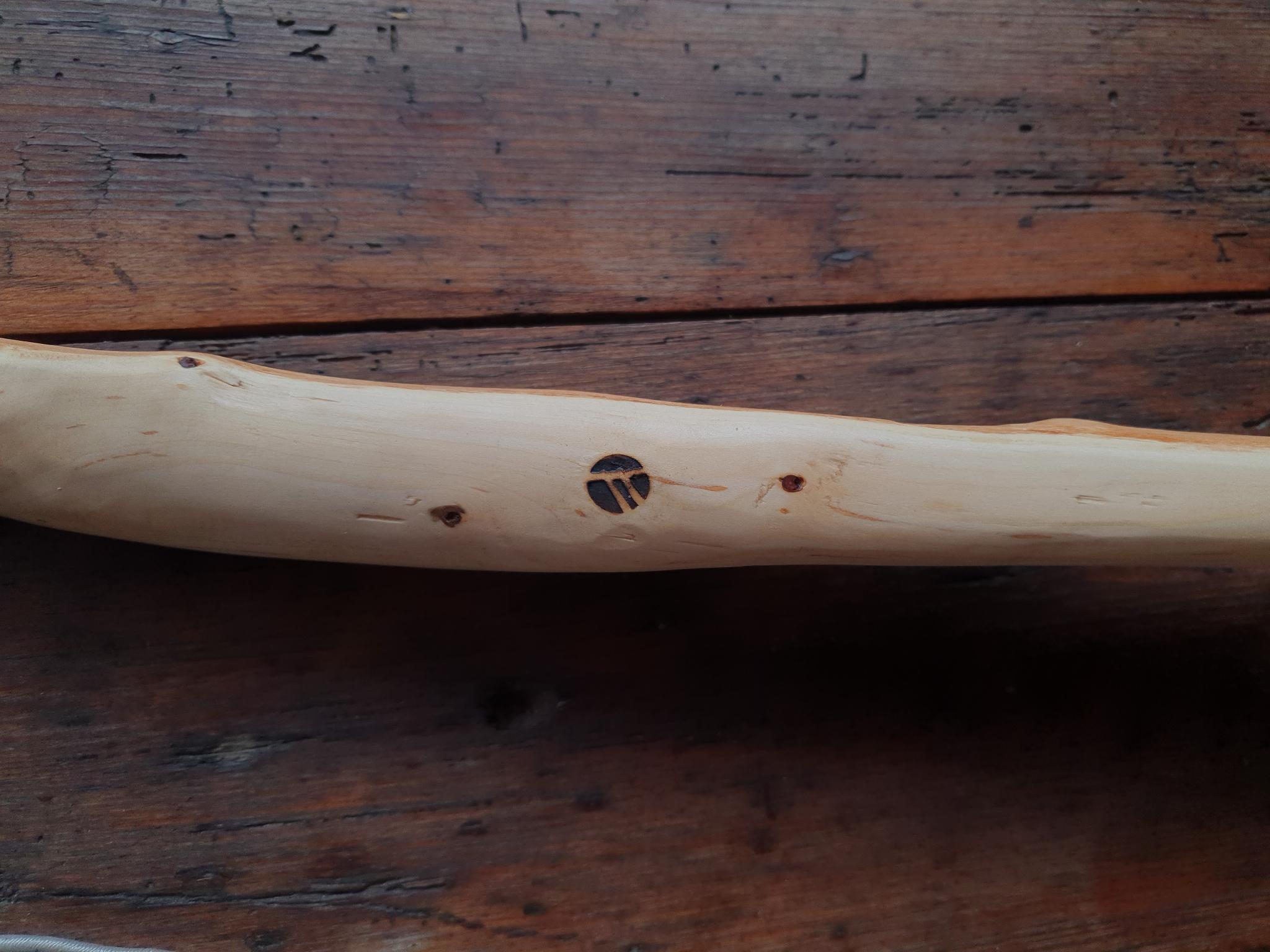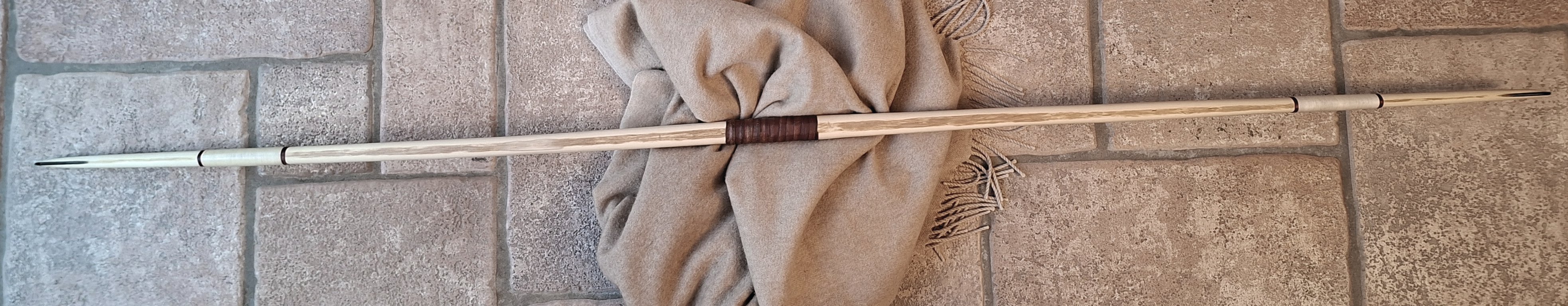 Ein sehr kurzer Stabbogen aus einem Stängel von nur 22mm Durchmesser aus einer Hartriegelhecke in meinem Garten. Die Sehnenlage hatte sich immer wieder beim Aufspannen verzogen weshalb ich ihn gekürzt habe und schließlich den Bogenbauch sehr einseitig abgetragen habe. Nun passts. Oberhalb des Griffs knitterte er heftig wegen eines quer sitzenden Astes. Deshalb war eine Reparatur nötig. Diese ist unter Nutriafell versteckt. Der Bogenbauch ist leicht geröstet.