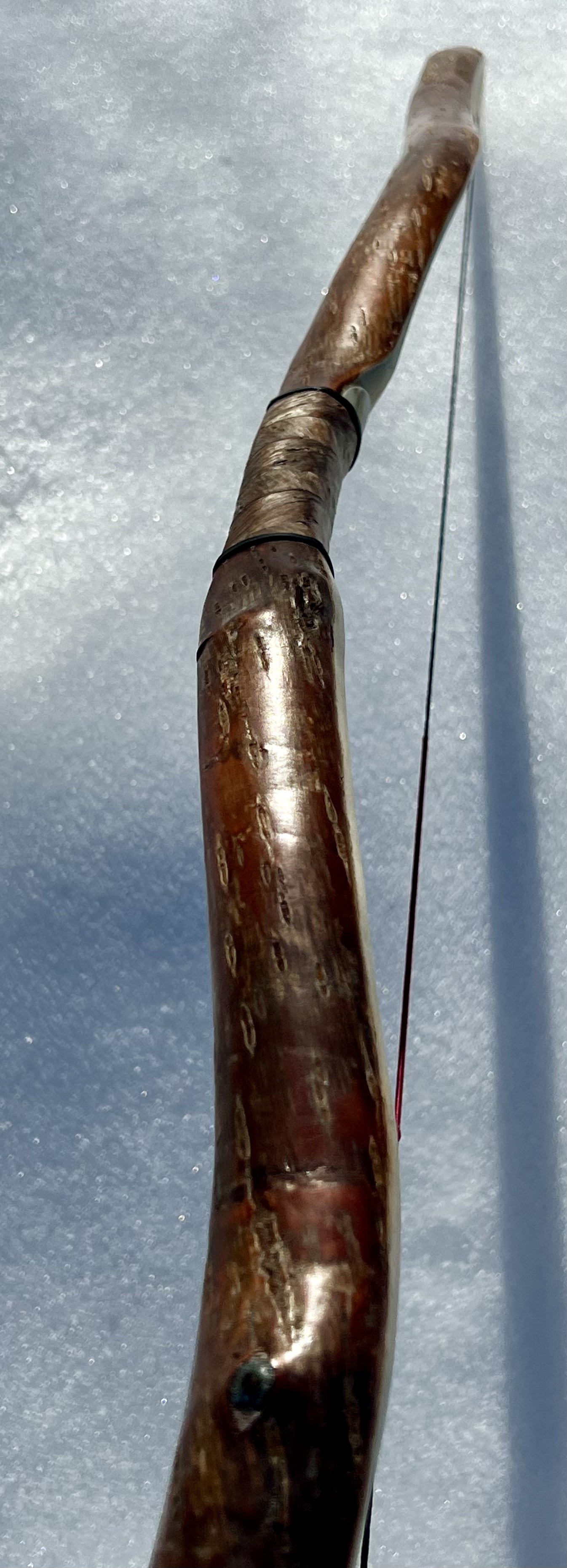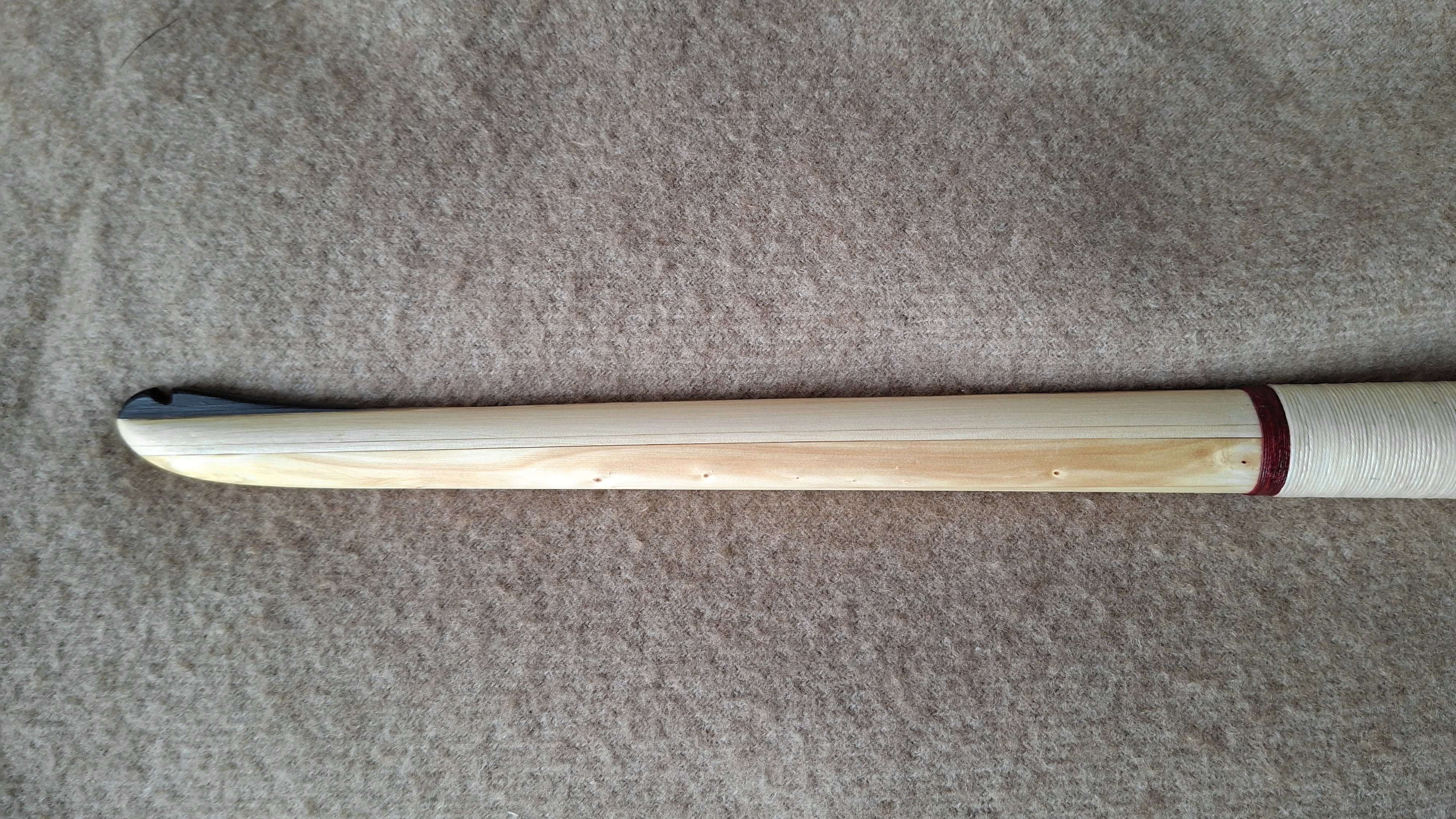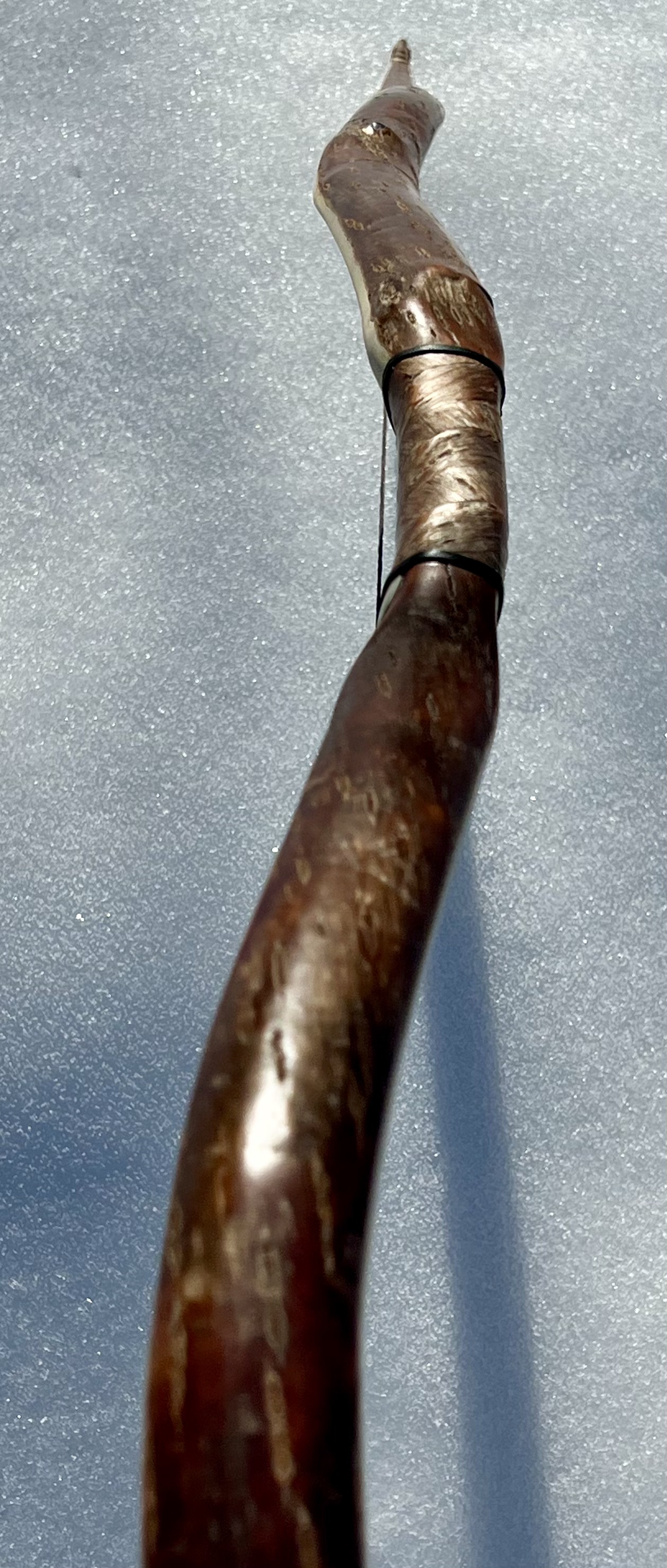 Ein sehr kurzer Stabbogen aus einem Stängel von nur 22mm Durchmesser aus einer Hartriegelhecke in meinem Garten. Die Sehnenlage hatte sich immer wieder beim Aufspannen verzogen weshalb ich ihn gekürzt habe und schließlich den Bogenbauch sehr einseitig abgetragen habe. Nun passts. Oberhalb des Griffs knitterte er heftig wegen eines quer sitzenden Astes. Deshalb war eine Reparatur nötig. Diese ist unter Nutriafell versteckt. Der Bogenbauch ist leicht geröstet.