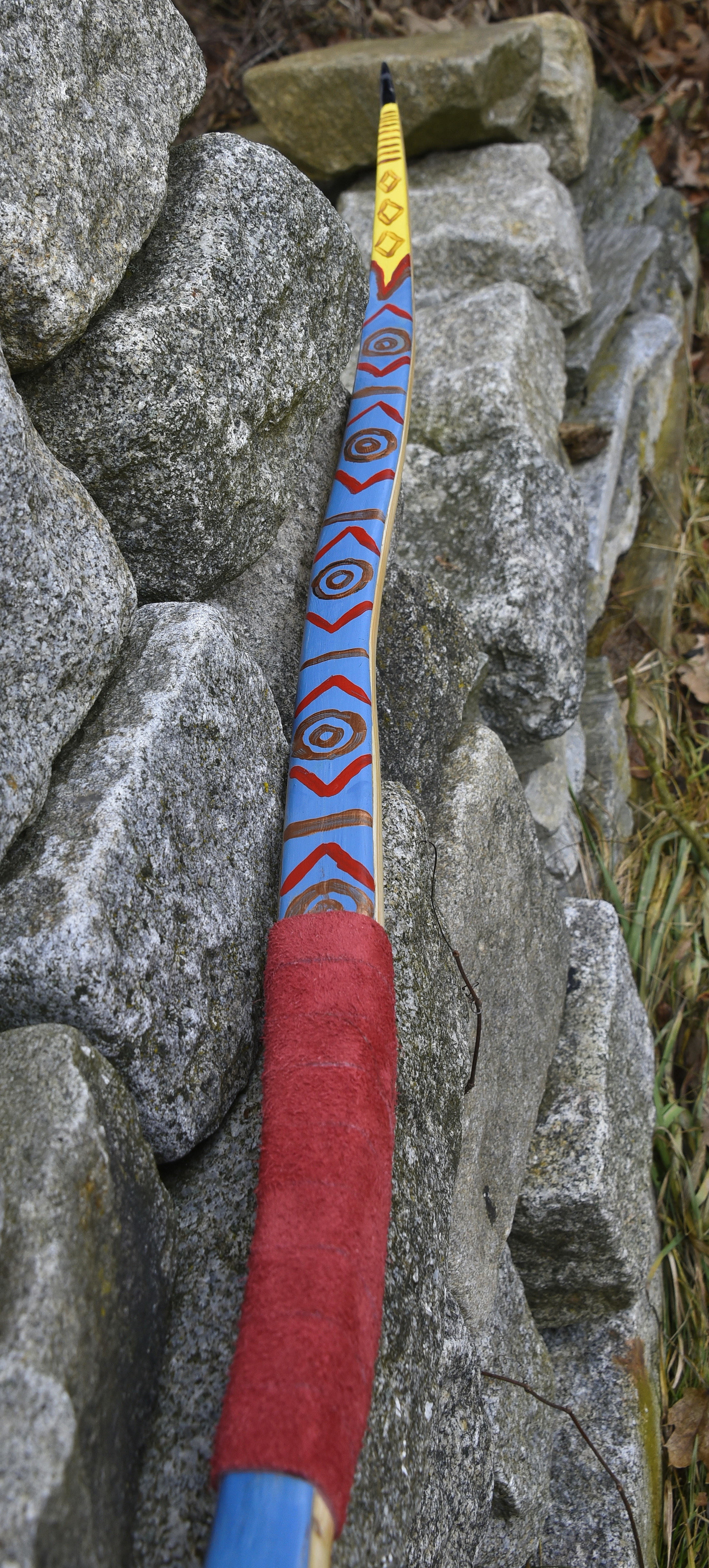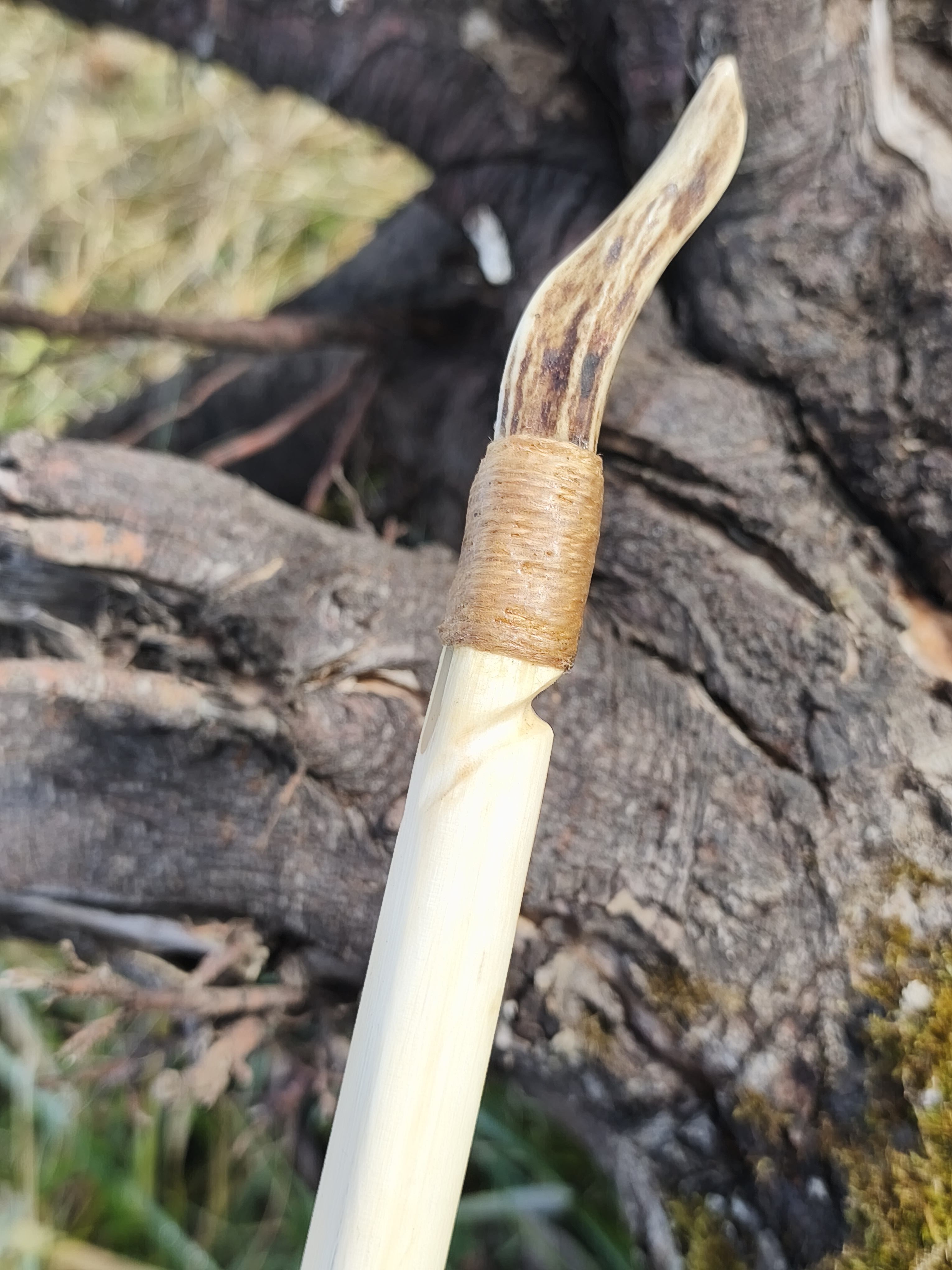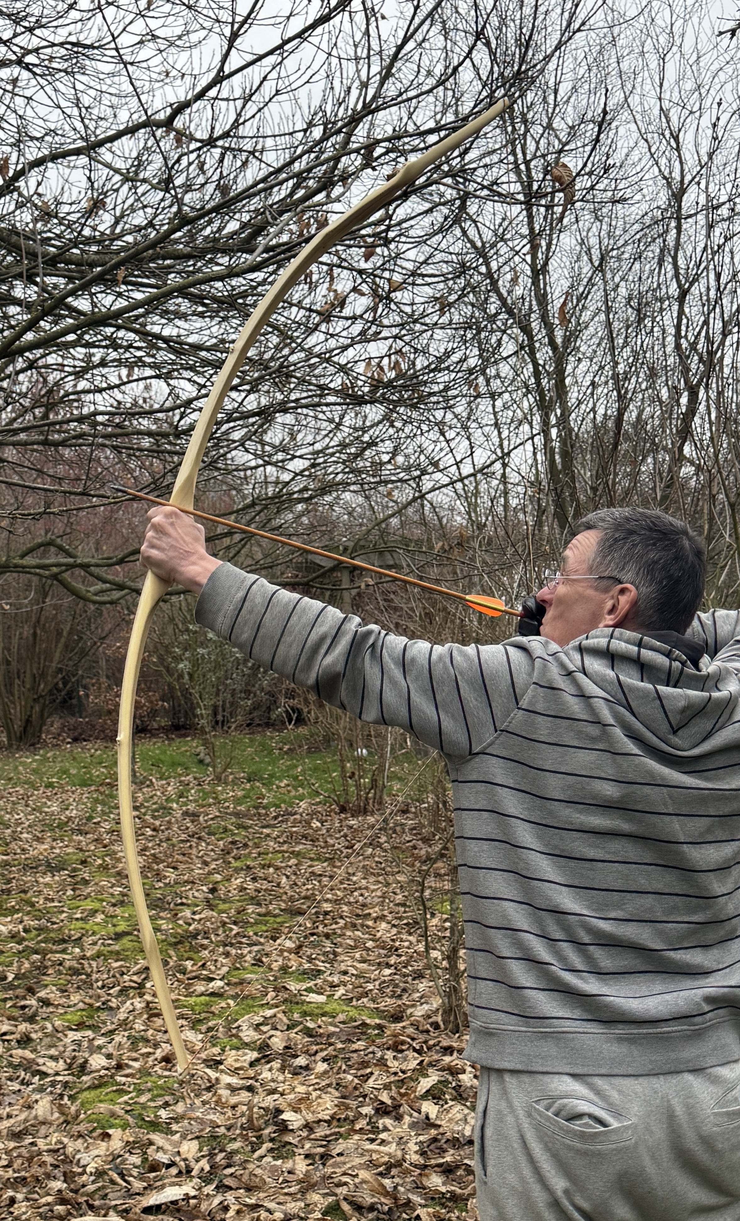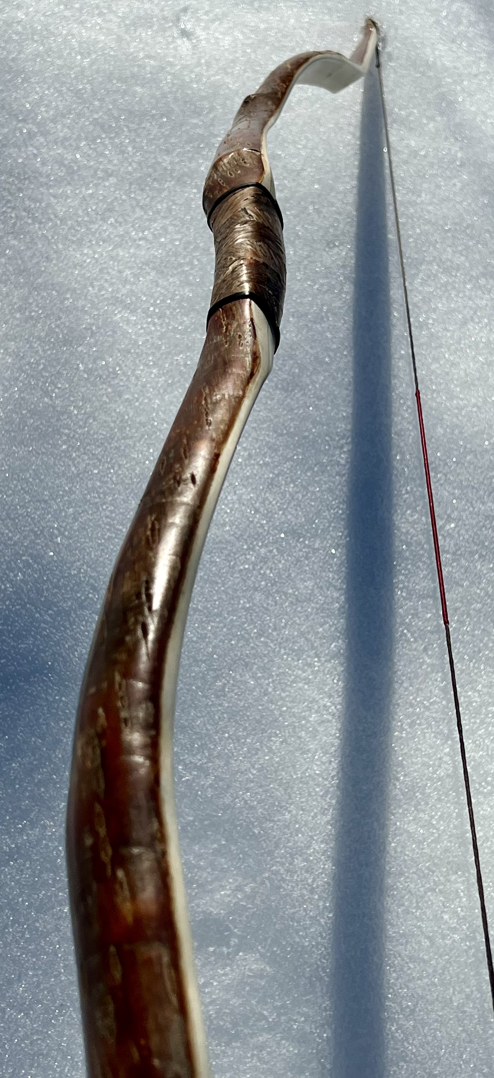 Ein sehr kurzer Stabbogen aus einem Stängel von nur 22mm Durchmesser aus einer Hartriegelhecke in meinem Garten. Die Sehnenlage hatte sich immer wieder beim Aufspannen verzogen weshalb ich ihn gekürzt habe und schließlich den Bogenbauch sehr einseitig abgetragen habe. Nun passts. Oberhalb des Griffs knitterte er heftig wegen eines quer sitzenden Astes. Deshalb war eine Reparatur nötig. Diese ist unter Nutriafell versteckt. Der Bogenbauch ist leicht geröstet.