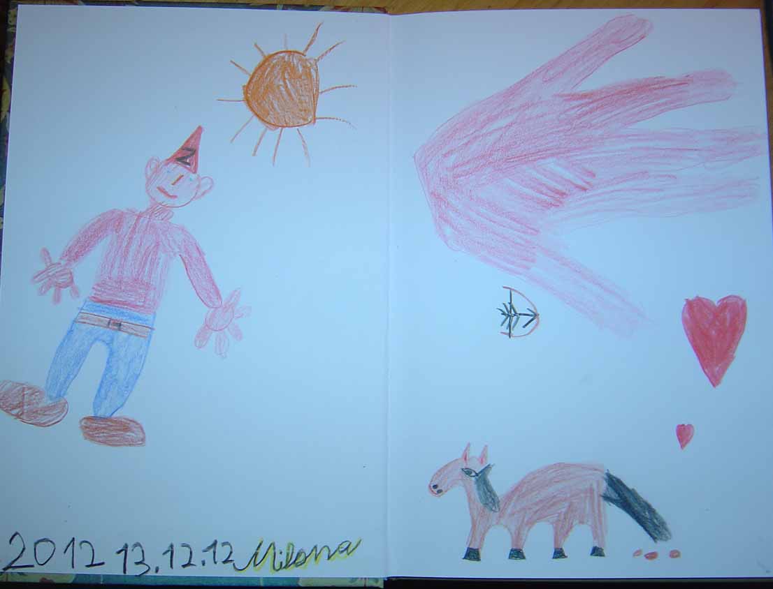 Als nun Milena das Pferd und den Bogen gemalt hatte, wusste Sie kurz nicht weiter. In dem Moment sagte ich halt: " mal doch ein Verschwindezwerg". In dem Moment kam mir die benzi-Zwerg-Frotzelei wieder in Erinnerung, aber da war es schon zu spät.
