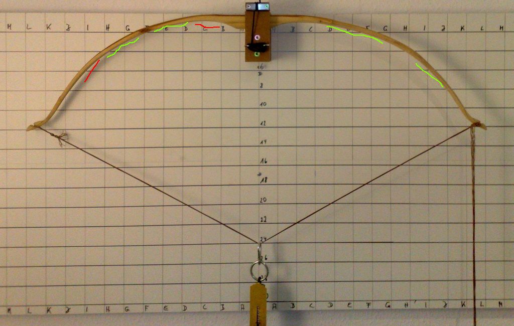 So abwegig ist Dein Tiller gar nicht. Im Wurfarm sind natürliche Knicke drin und die auf dem Bild rechts grün markierte Stelle scheint eher gerade bzw. sogar etwas deflex zu sein.