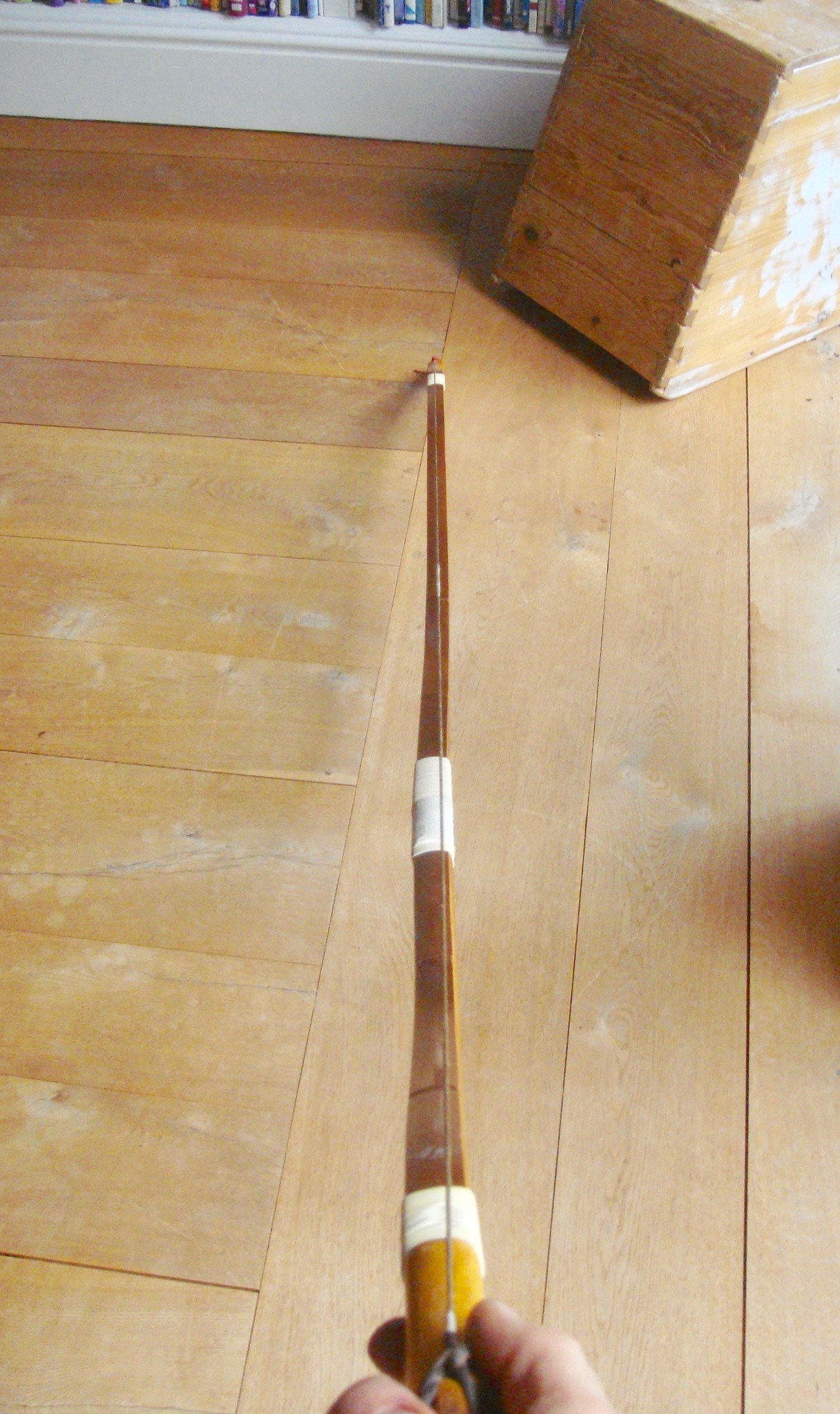 Noch was zu meinem 70 Jahre alten Bogen - Der erste (es sind sogar zwei) wurde Ende der 40/Anfang der 50er Jahre über verschlungene Wege direkt in Japan geordert und hier ohne jegliche Anleitung geschossen. Weil der erste im Griffbereich gebrochen ist (mind. 25 kg Zuggwicht, Nobisun), hat der Besitzer sich einen zweiten Bogen schicken lassen.