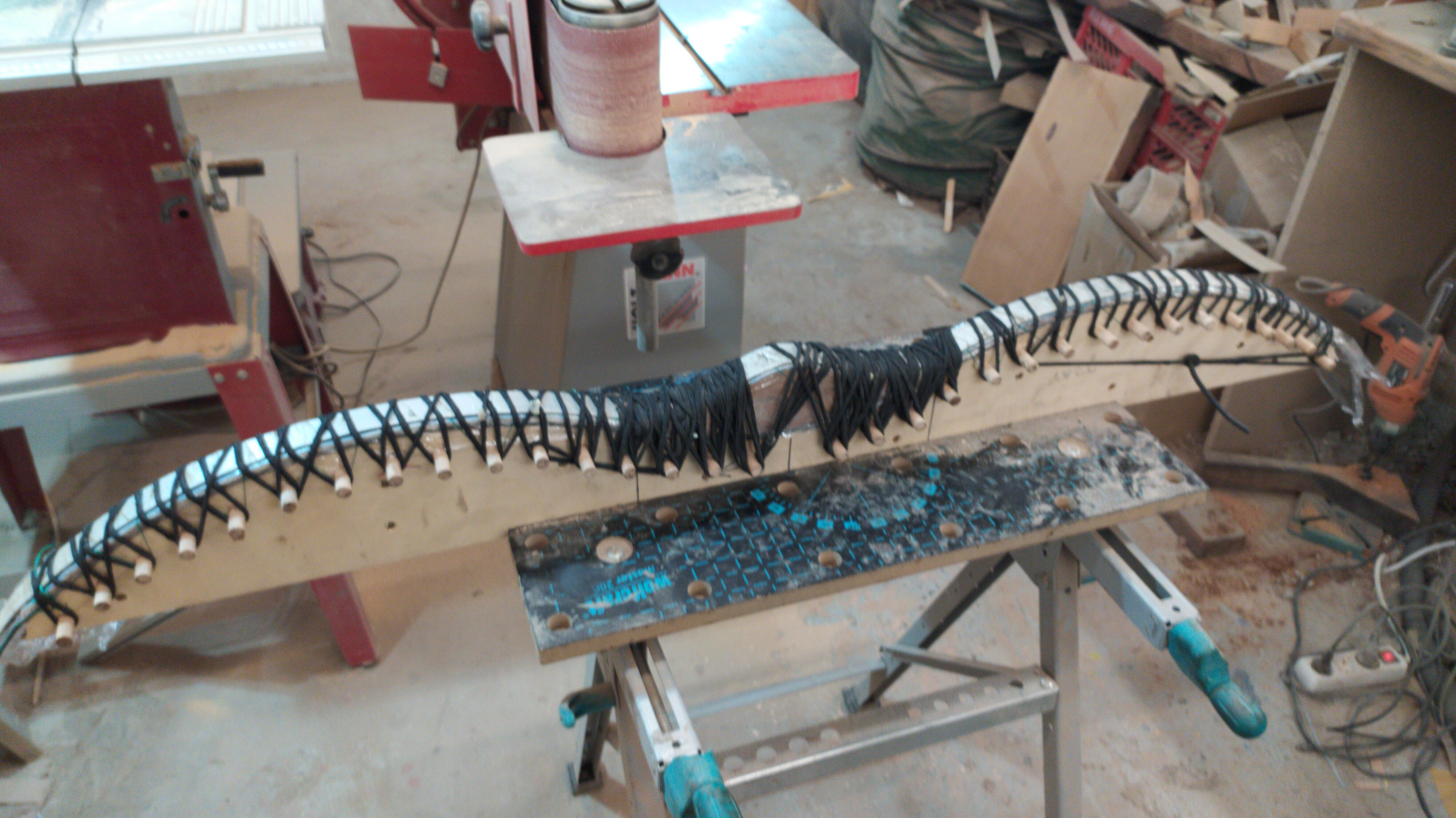 So habe ich das am Anfang gemacht, bevor ich mit geschlossenen Formen und Druckschlauch gearbeitet habe. Da ist ne 2mm Alu Schiene drüber und das ganze mit ca. 10m 10mm starkem Gummiseil verzurrt.