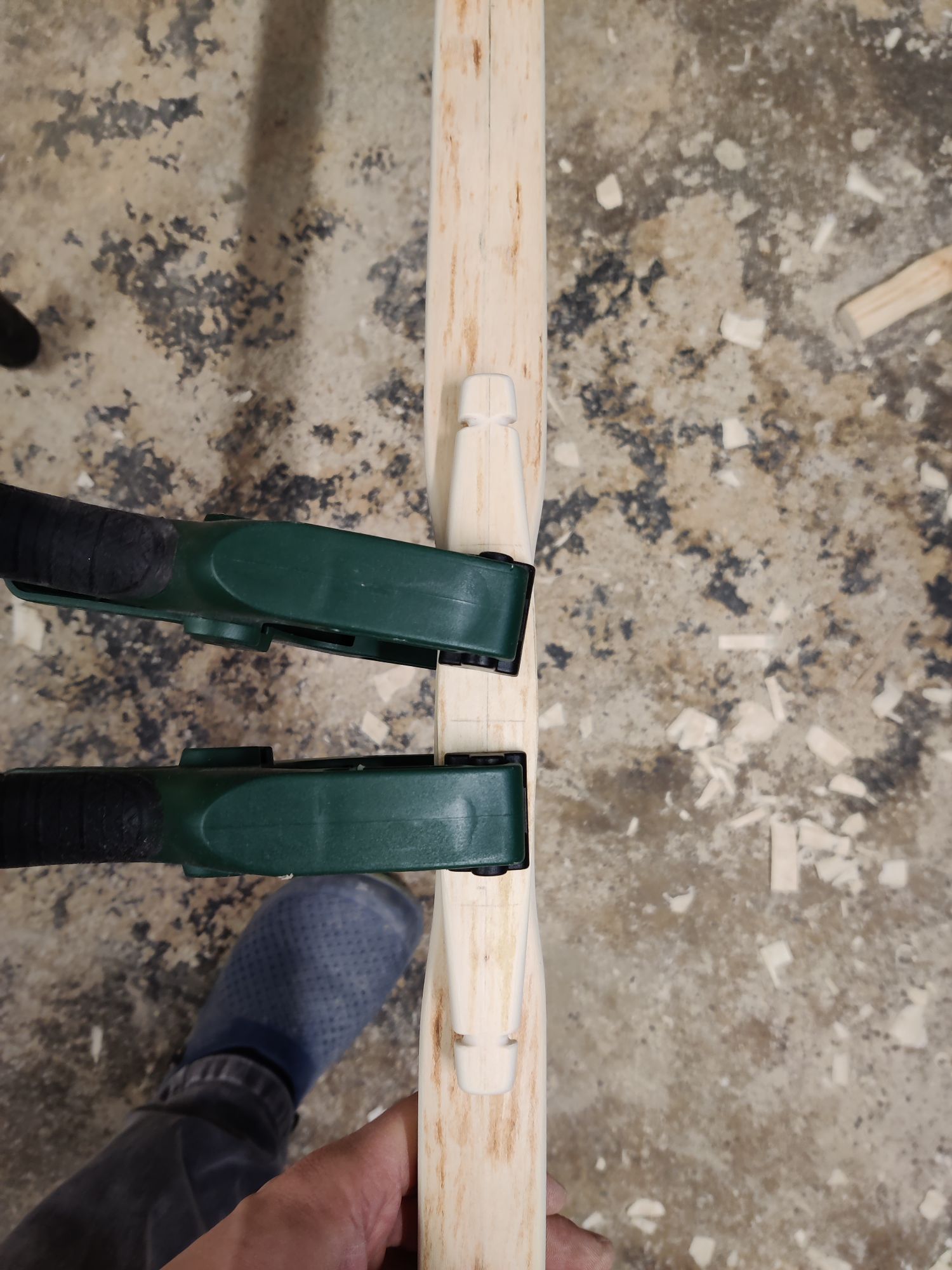 Jetzt hab ich wieder eine Verwendung für den kleinen Vorbogen den ich vorbereitet hatte. Ich leg den Stab für die Sehneneinhengungen in den Astreinen Wurfarm.