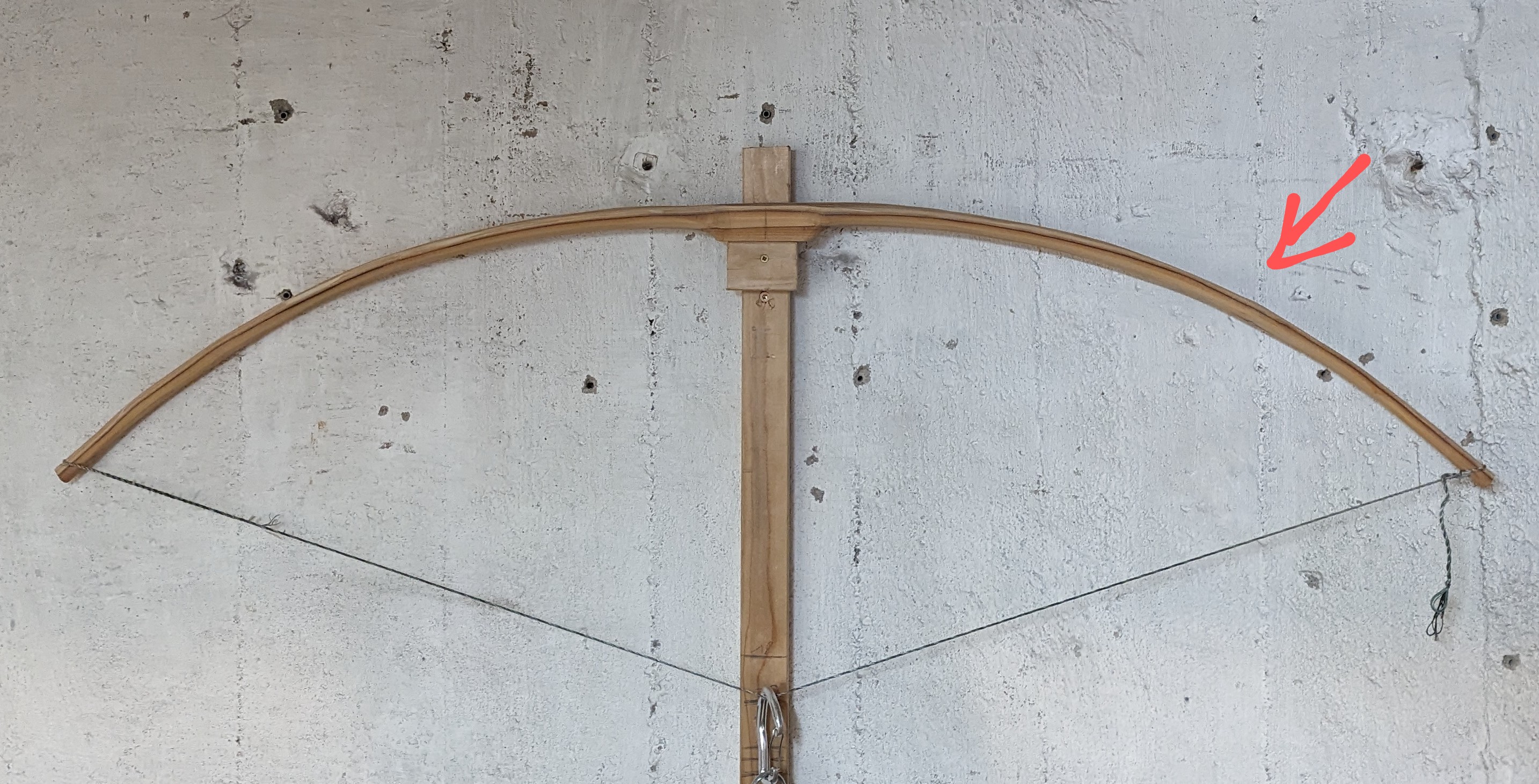 Nachdem ich gestern angefangen habe den rechten WA etwas zu schwächen. ( Vielleicht zwei bis drei züge mit der Ziehklinge) ist mir der Bogen dann beim mehrmaligen Pumpen auf vielleicht 15" gebrochen. Ca 10cm vor der Aststelle im rechten WA ungefähr dort wo ich im vorherigen Post die Stelle mit dem roten Pfeil markiert habe.