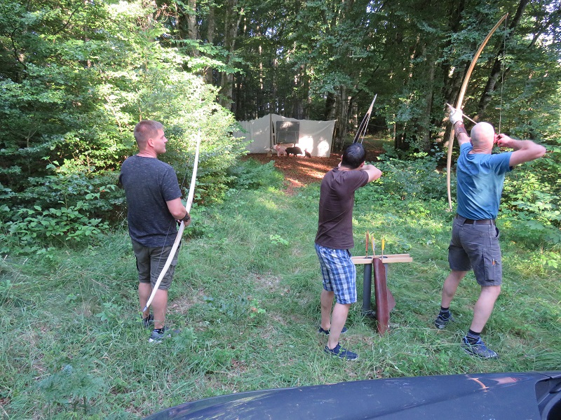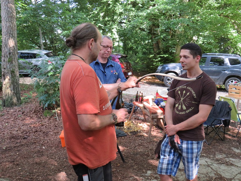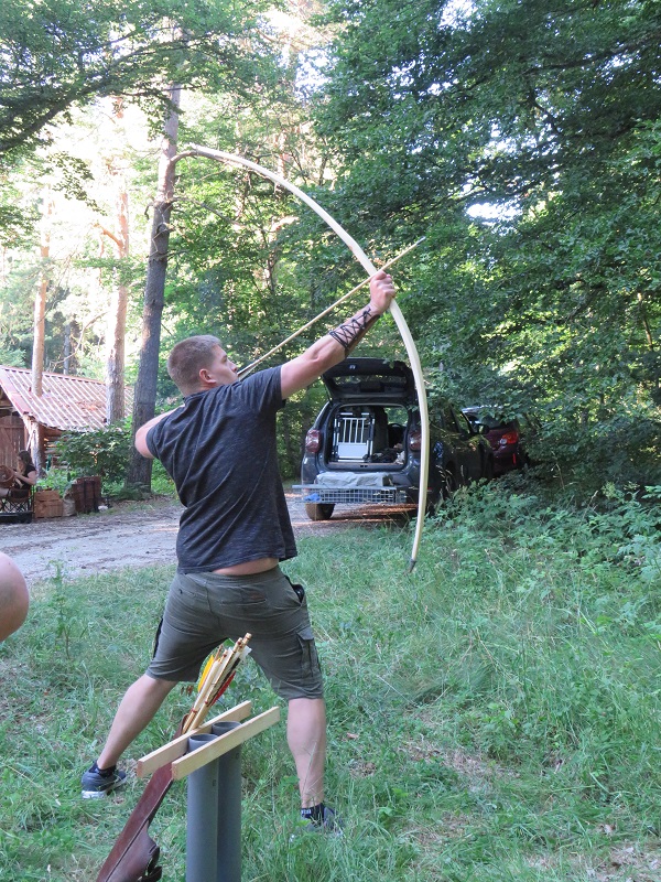 Nun... ich hatte einen 70#@32'' deflex/reflex Bogen Bambus Osage mit, der den Record von 324m aufstellte. Mit diesem Bogen habe ich dieses Jahr von allen am weitesten geschossen und zwar 310m. Leider kam ich an meinen Record nicht dran. Auch den Bogen vom Saptunier und einen Trilam Bambus/Kirsche/Osage mit 78#@24'' hatte ich dabei, jedoch ohne Erfolg...bin nicht über die 285m heraus gekommen.