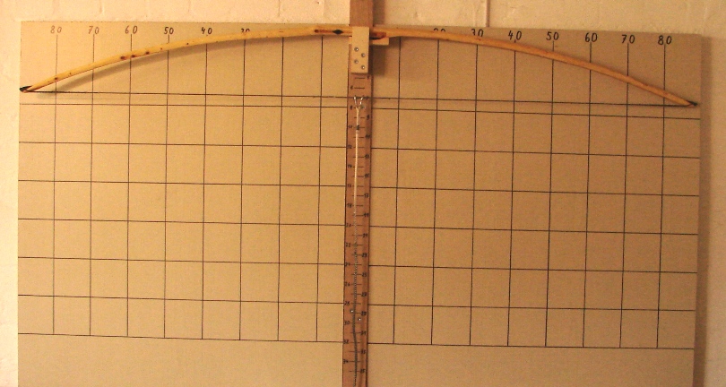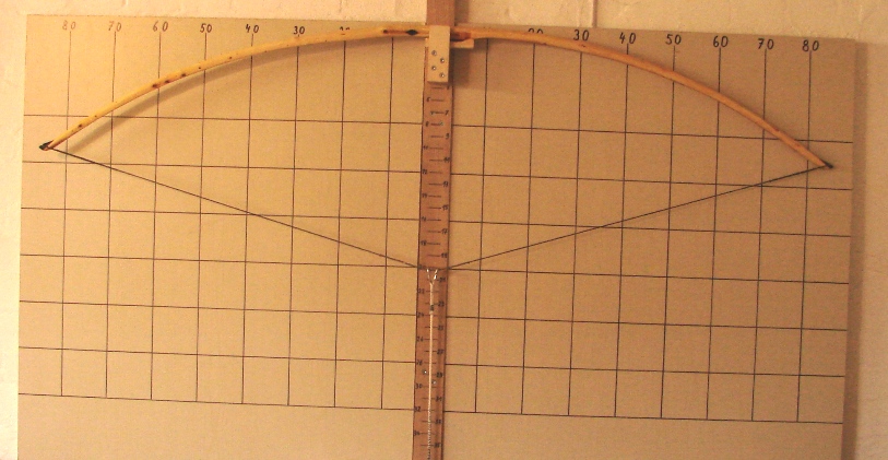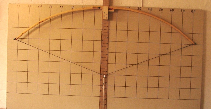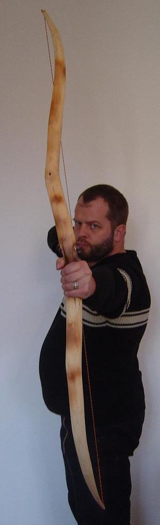 Entstanden ist dieser Bogen weil ich Wissen wollte ob es sich lohnt, solche dünnen Baumspitzen, wie man sie auf den meisten Eiben findet, mitzunehmen. Bisher habe ich solche Spitzentriebe nur zu Messergriffen, Pfeilsuchkratzern und Beilstielen verarbeitet. Ich muß sagen: „Ich bin Überrascht“. Ich hätte nie gedacht das der Bogen 50# erreichen kann und einen Auszug von 30“ Zoll ohne klagen aushält. Das Tillern war ein Witz, keine 30 Minuten und ich war bei 30“Zoll Auszug. Ich hatte mir die Seiten mit den wenigsten Ästchen als Rücken ausgesucht und die künftigen Bauchseiten mit der Kreissäge besäumt danach noch die Seitenflächen besäumt und die Rinde entfernt. Durch diesen gegebenen Taper fiel das Tillern sehr leicht. Die meiste Arbeit haben die Hornteile gemacht, ohne die, dauerte die Arbeit am Bogen höchstens 5 Stunden Netto. Oberfläche mit Leinölfirnis eingelassen, bis jetzt 3 Schichten.