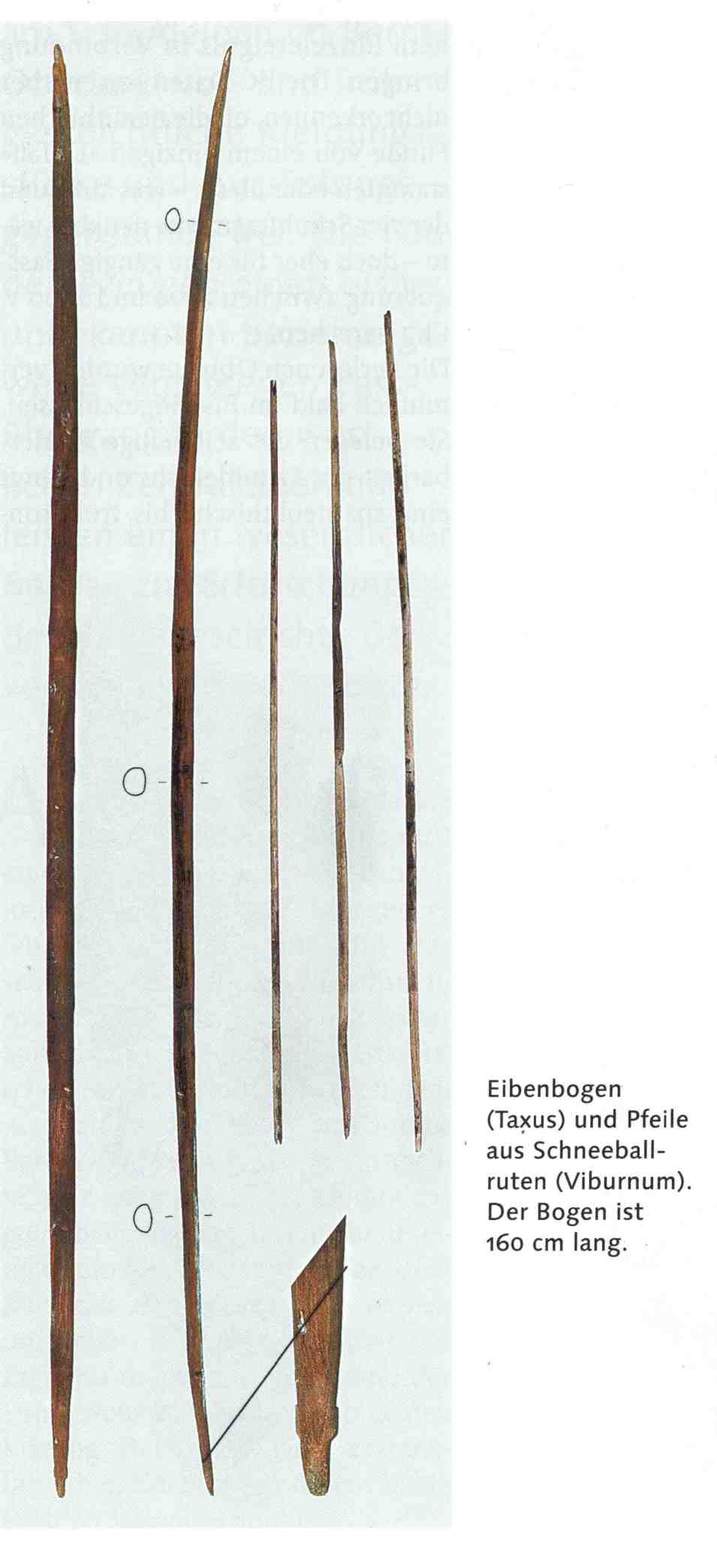 Der Bogen vom Schnidejoch ist aus Eibe und 160 cm lang. Bei ihm wurden Pfeile aus dem Schößling des wolligen Schneeballs gefunden und ein genähter Rindenköcher .