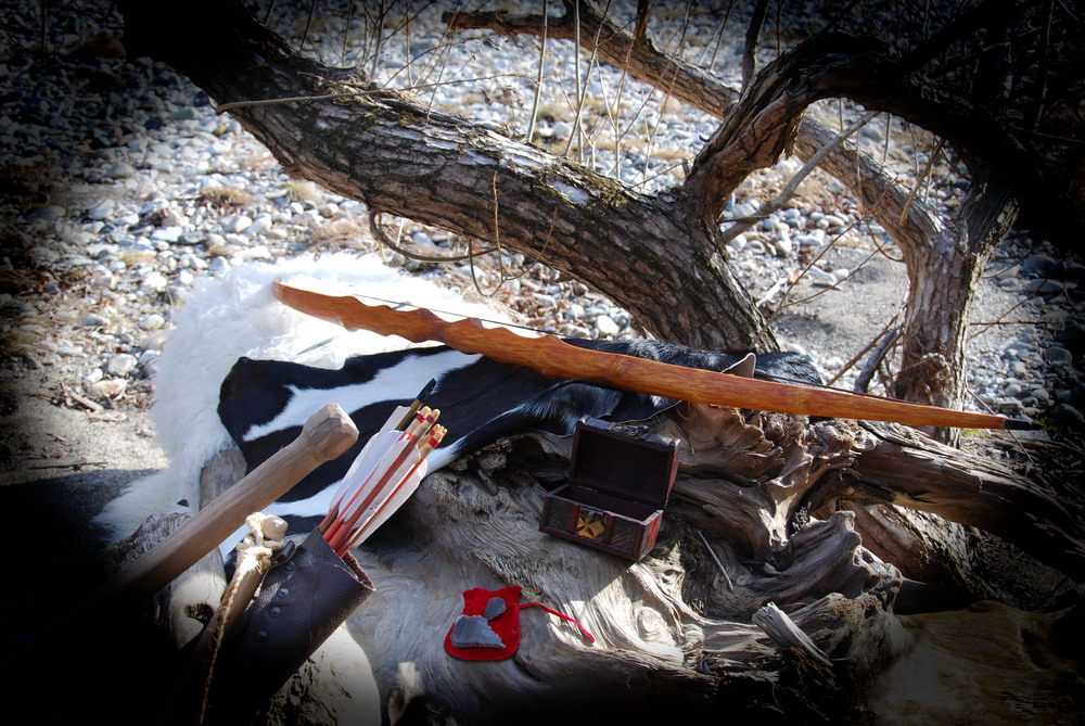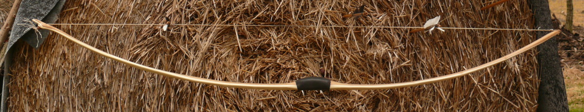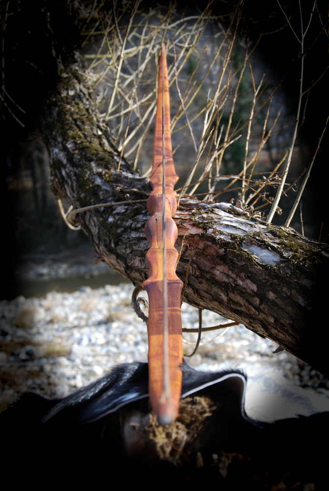 Die Idee dahinter war, einen schlichten, funktionalen Bogen zu fertigen und sich dabei auf wenige "einfache" Werkzeuge zu beschränken. Aufgrund der natürlich gewachsenen Form des Holzes, hatte ich mich entschlossen, dem Bogen ein dem Winkingertypus ähnliches Design zu geben; daher die "langen Nocken".