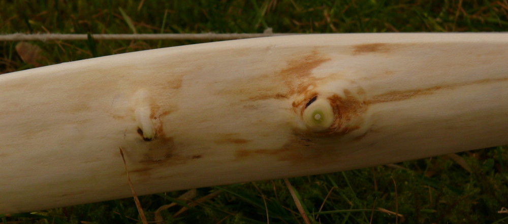 Vollauszugaufgespannt..und entspanntDetails: oberer Nock, Drachenzähne aus Rinderknochen.. von der anderen SeiteGriff hat einen Riss bis zum Markkanal - das muss man doch irgendwie nutzen...Bauch..und Rückenansicht das wars zu DRAGONOK ;ich hoffe es fehlt nix