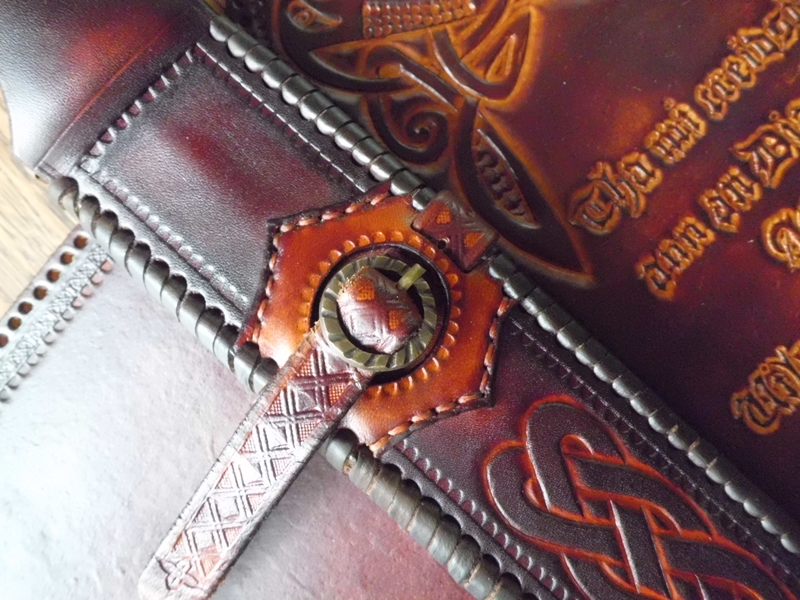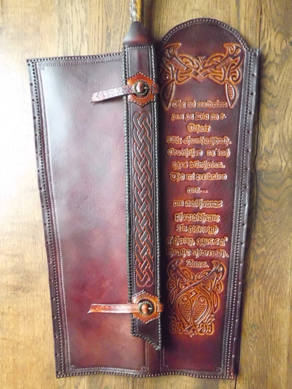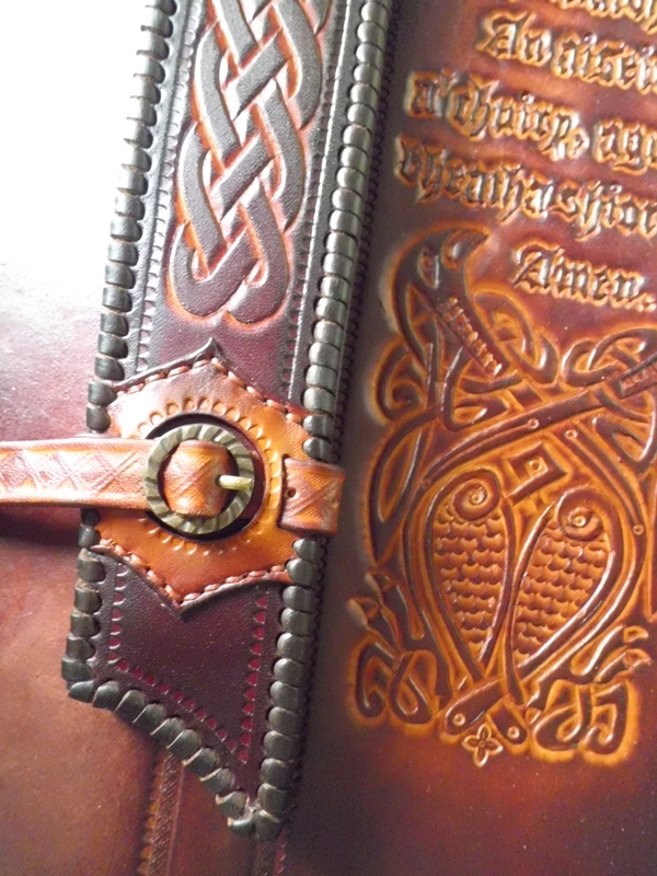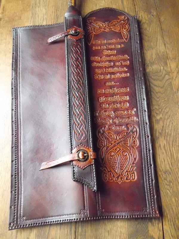 -Wenn das Leder kurz vorm trocknen ist kann die Umrandung entlang der eingeschnittenen Linien mit den Anschräger Werkzeugen (punzier Eisen) bearbeitet werden die Unebenheiten kann man dann noch mit einem glattem Holz Spatel oder Bein Spatel bearbeiten.