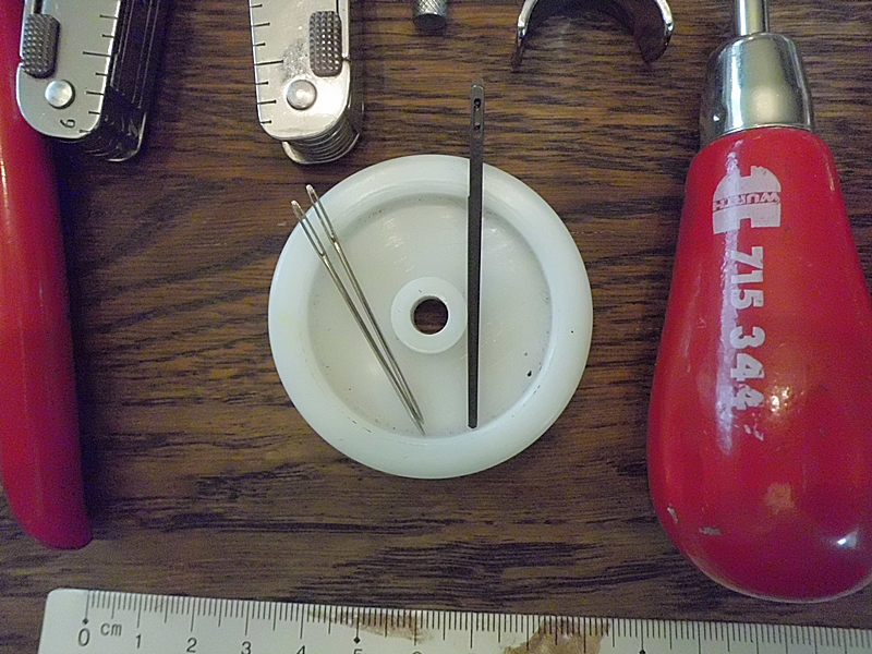 -Mit dem Nahtroller, in diesem Fall 5mm Abstand von Loch zu Loch da ja 5mm Flechtband benutzt wird, die naht abrollen und dann Lochen (entweder Ahle oder Lochzange, kann selbstverständlich auch mit einem Scharfem Bohrer gebohrt werden)