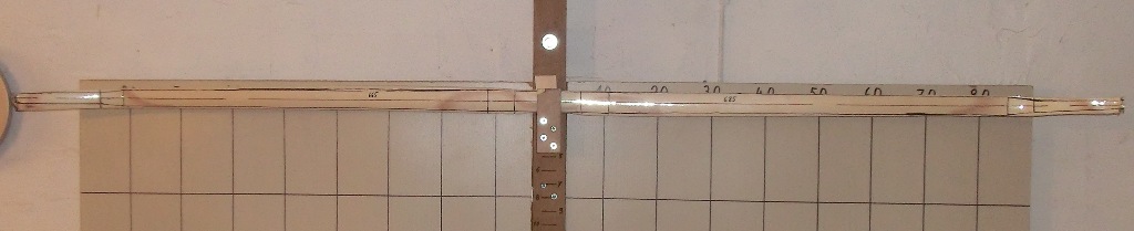 Hier sieht man auch den groben Schnitzer den ich damals beim Bau meines Tillerboardes gemacht habe, die Boardtafeln sind viel zu tief angebracht, dafür sind sie insgesammt zu hoch geworden. Ein Bogen mit starken Reflex ragt im entspannten Zustand weit über das Board hinaus, dafür kann man aber auf der unteren Hälfte der Tafeln wunderbar den geraden Sehnenverlauf im Vollauszug beobachten. ::)