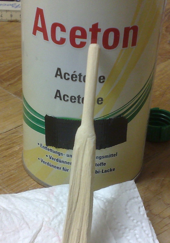 Hallo Allerseits, Heute war eine Aststelle zum bearbeiten dran - Ein ca. 6mm durchmessendes Astloch mit Epoxid und Dübel füllen: Die Stelle habe ich aufgebohrt, einen Dübel aus dem gleichen Holz geschnitzt und reingeklebt. Die Stelle habe ich dann noch mit der HLP erhitzt, um verbliebene Luftbläschen aufsteigen zu lassen - waren auch noch ein paar drin.