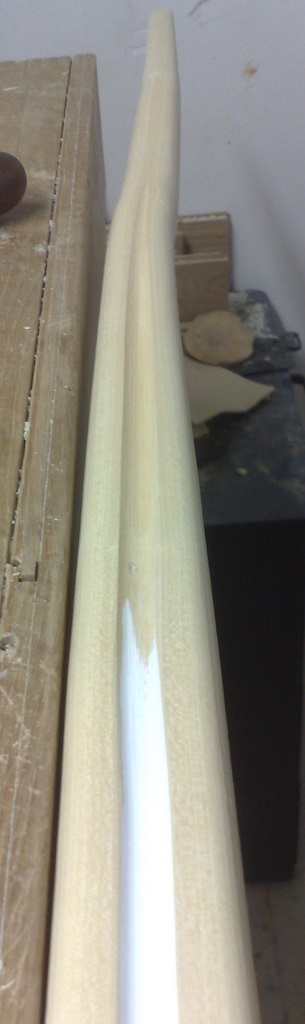 hallo, also nachdem ich mehrere Stücke aus dem Stamm zerbrochen habe, muss ich sagen, dass dieser Holunder zuerst am Rücken bricht. Die Rohdichte ist übrigens bei ziemlich genau 0,67. Deswegen habe ich den Bauch schlanker gemacht, als den Rücken. Und ich muss den einseitig längeren Markkanal nicht mehr über den Bauch oder die Seite ausgleichen.