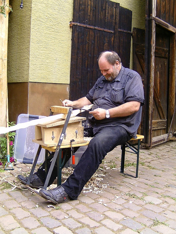 Ich habe mir eine komplette Bierzeltarnitur hier gekauft und mir für die Bank einen Aufsatz gebaut, den ich mit zwei Schraubzwingen befestigen kann.
