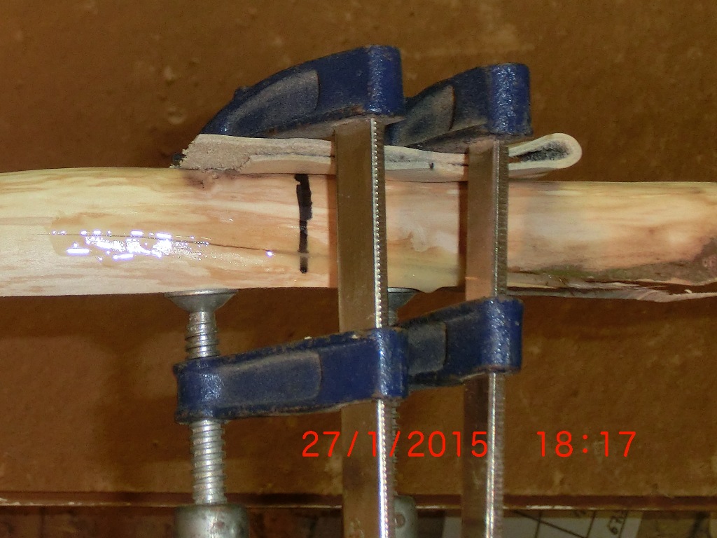 Bevor ich auch nur eine Minute Arbeit in die Griffgestaltung stecke, muß der Bogen sich wenigstens bis 26" Zoll ordentlich biegen. Nur, wenn ich jetzt mit dem Stave arbeite, dann stört mich der lose Span, also wurde er sozusagen fixiert. ;)