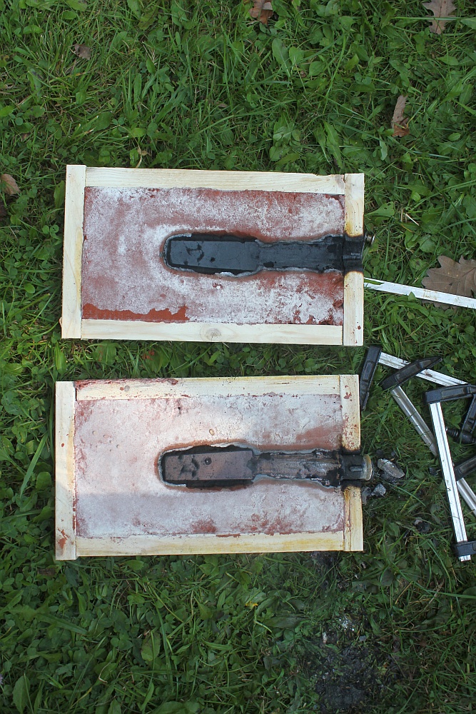 Wenn der Brenner mit dem Gebläse läuft, dann sieht es so aus. Dann gibt es noch selbstgebaute Formkästen , Formsand und eine lange Zange zum herausholen des Schmelztiegels aus der Esse. Bis auf die Gasflasche hab ich alles selbst gebaut-- eine 5kg Flasche reicht jetzt für 4-5 Güsse mit 500 g Bronze aus.