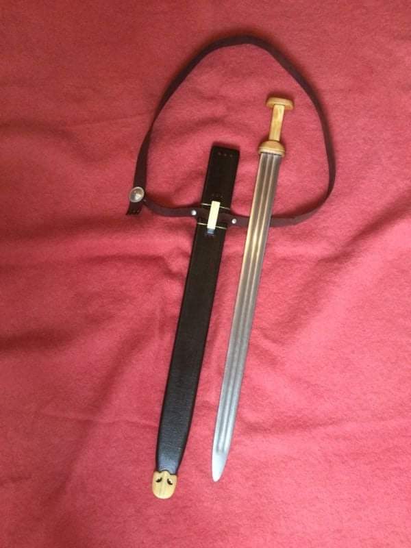 Die Schwertscheide hat einen Holzkern, mit Leder überzogen und mit Eisenoxid gefärbt.