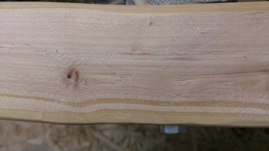 Leider musste ich Heute feststellen, dass ein ca. 25 cm langer Riss vom Bauch ausgehend bis fast zum Rücken durchgeht. Wenn man dann noch die äusseren extrem dünnen Ringe runternimmt, ist das Holz komplett durchgerissen. Und da das Ding Drehwuchs hat, isses mit Riss unbrauchbar. Iss wahrscheinlich beim spalten passiert :o