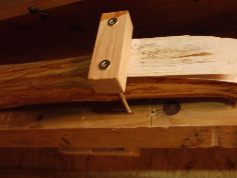 Stave mit Unterlegkloetzchen (fuer Reflex oder was weiss ich) auf den Balken legen und da, wo er runtergedrueckt werden muss, so ein 8cm Kloetzchen quer drueber und knapp rechts und links vom Stave einen fetten (6x120 bis 6x150) Spax reingezwiebelt.