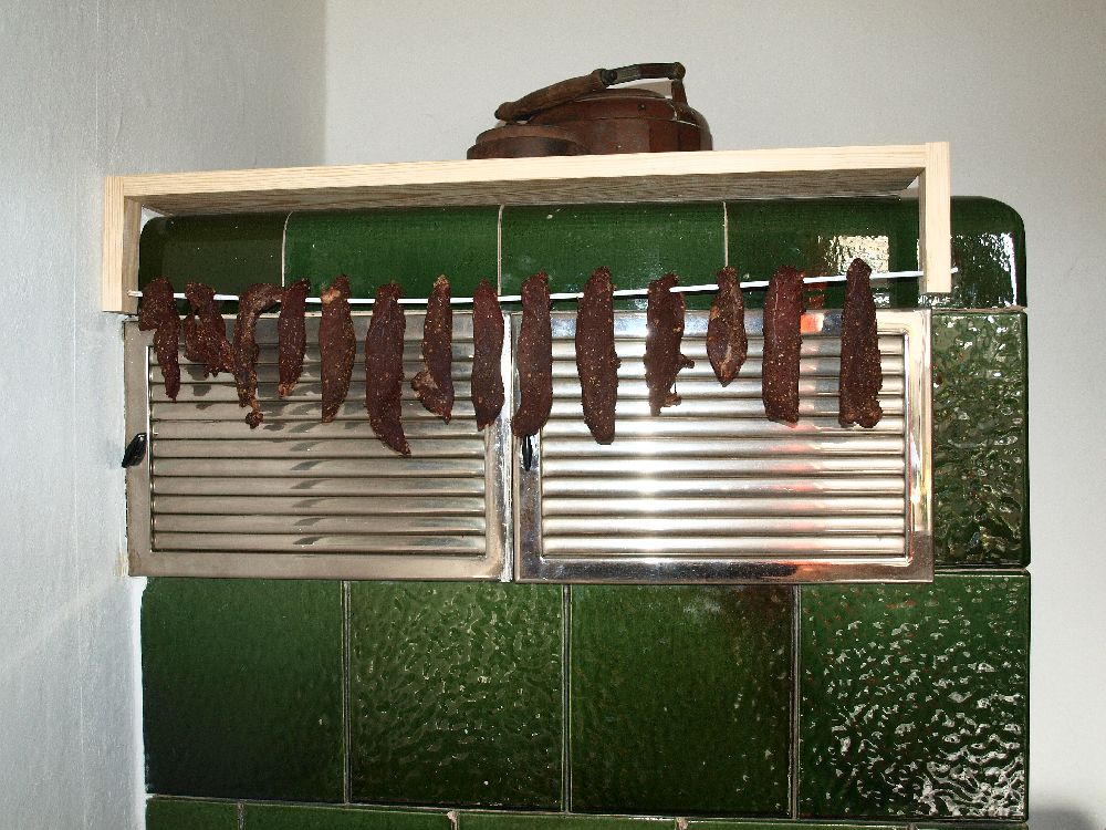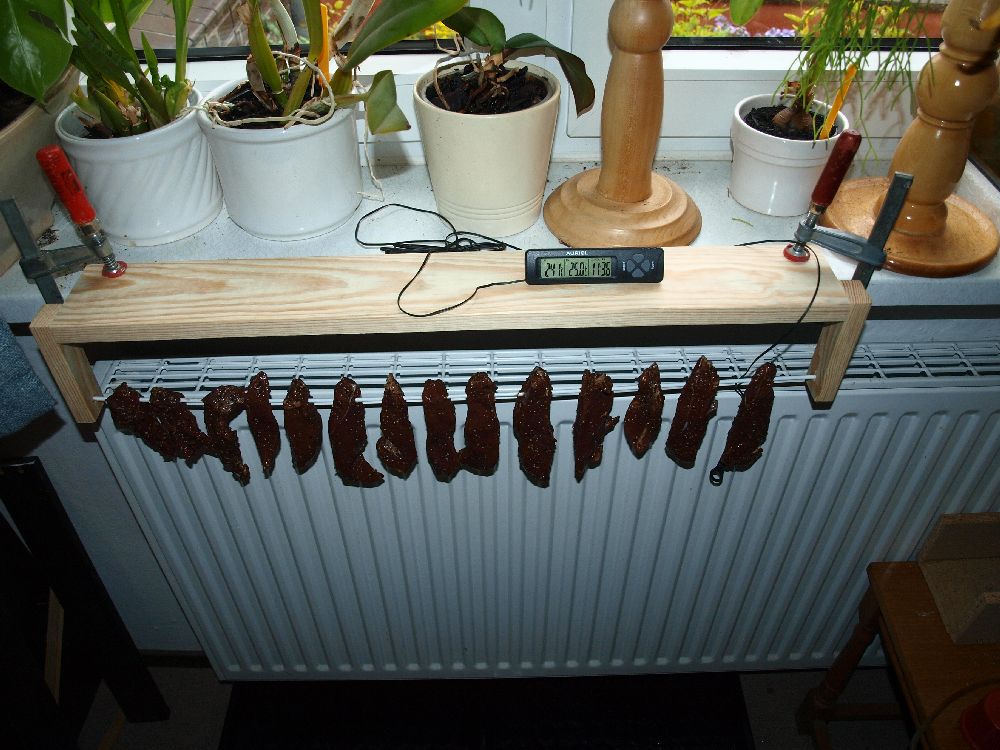 Bild 2: Einfache Aufhängekonstruktion zum Festklemmen am Fensterbrett. Die Fleischstreifen wurden über eine ummantelte Stahlstange ( 4mm) geschoben.