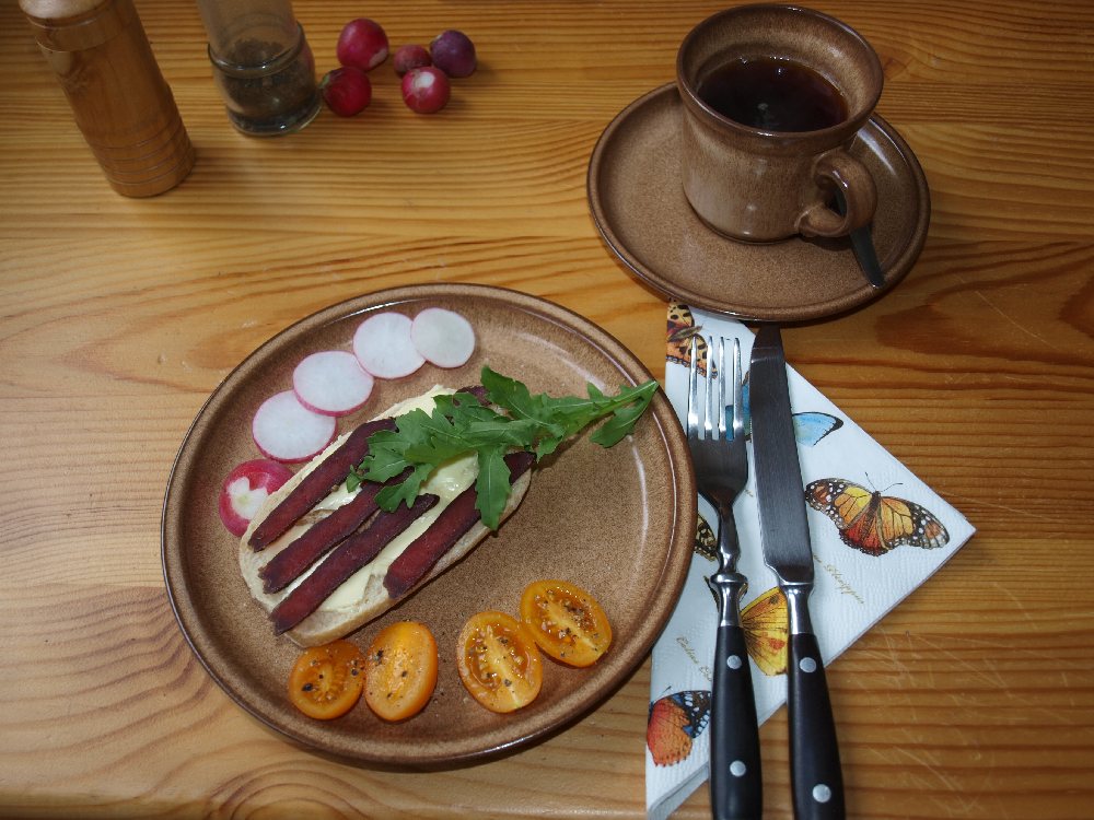 Vorab habe ich jedoch streng nach dem o.g. Rezept 0,5 kg Damhirschkalb (aus der Keule) in Streifen geschnitten (Querschnitt ca. 2x 3 cm) und 24 h in der Beize ziehen lassen (Plastiktüte Kühlschrank). Zwischendurch immer mal wieder durch die Tüte geknetet.