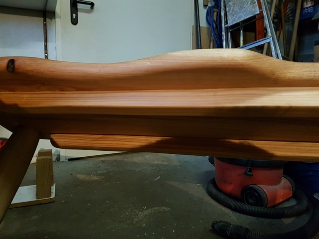 Ich habe die Beine gut 4,5cm überstehen lassen damit über den Löchern die die Keile aufnehmen genug Futter bleibt, sodaß ebendiese unter Spannung nicht aufreißen.